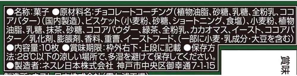 - Raw material: Chocolate coaching (vegetable oils, sugar, lactose, full powdered milk, cocoa butter) (domestic manufacturing), biscuits (flour, sugar, shortening, salt), flour, vegetable oils, lactose, matcha, sugar, cocoa powder, green tea, All powdered milk, cocoa mas, yeast, cocoa butter/emulsifier, inflated agent, fragrance, baking soda, yeast food, (including wheat, milk ingredients & soybeans)