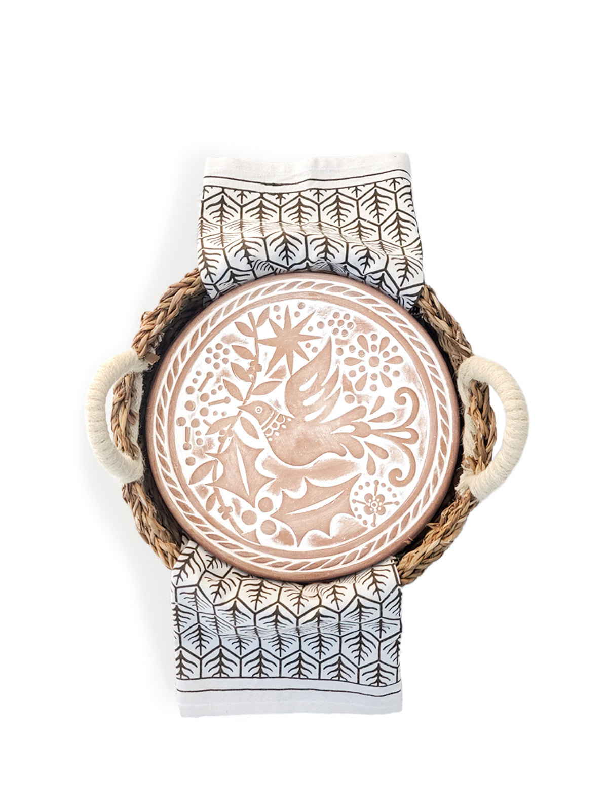 KORISSA Bread Warmer & Basket Gift Set with Tea Towel - Bird Round by KORISSA wholesale product delivery near me | | Fulfilled by our friends at KORISSAAbout This HandicraftAdd a bit of artisan-inspired style to the kitchen with a terracotta bread warmer and hand screen printed tea towel. Engraved with a bird design and cut to fit neatly into a round basket, this terracotta special bread warmer is naturally insulating, and the basket itself has been handwoven from sustainably grown seagrass. The tea towel is great for drying dishes or hands in the kitchen, lining a bread basket. They are the best gift items for anyone who loves bread!Included items, (1) Terracotta Breadwarmer, (1) Seagrass basket and (1) Tea towel of your choice. Each product is designed and curated by KORISSA, sustainably handmade by Fair Trade artisans in Bangladesh. Dimensions & More DetailsSize: Approximately - (Bread Warmer) 0.5"tall x 9”round- (Basket) 3.25"tall x 11"round- (Tea Towel) 19.50" wi..