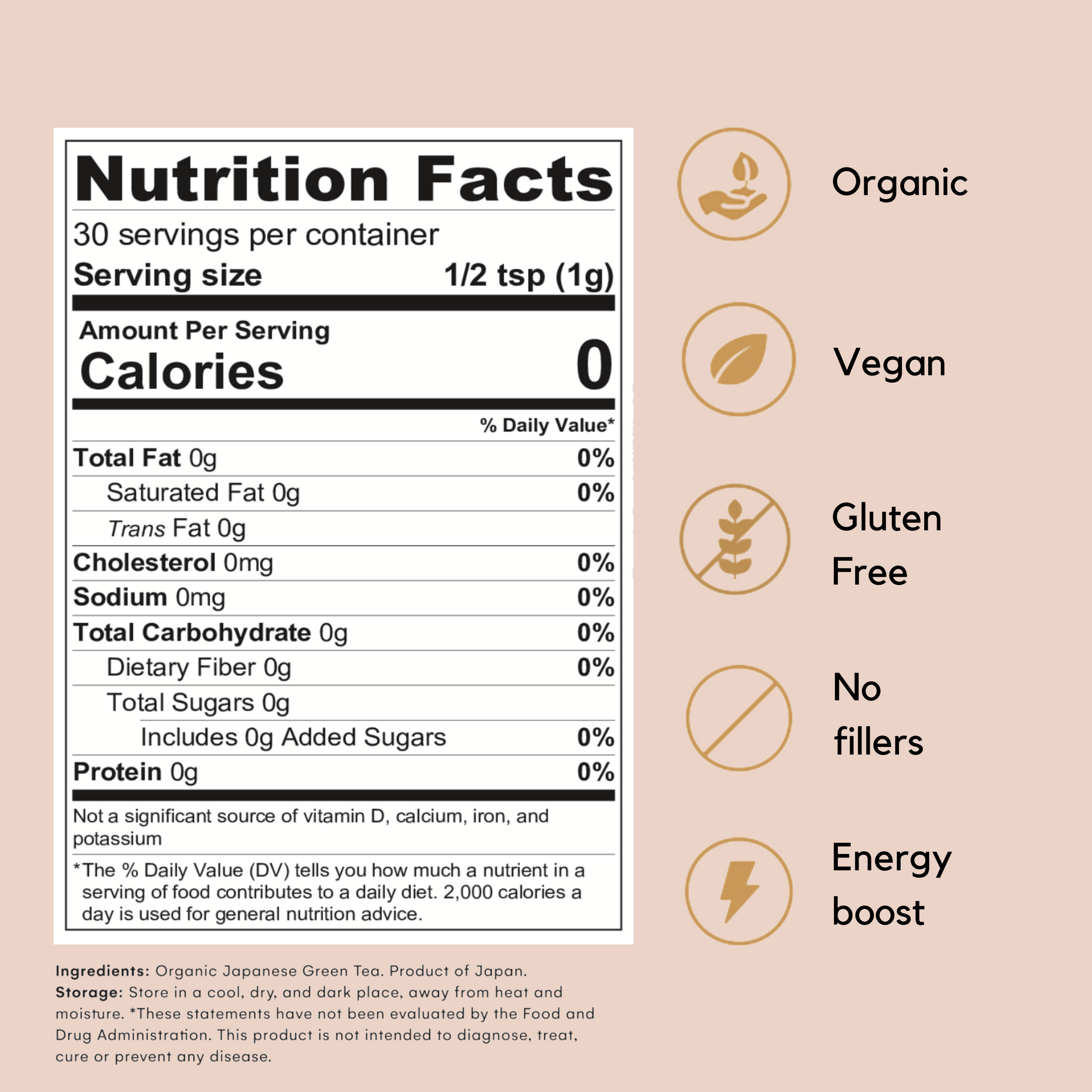 - Only one ingredient! Green tea powder. No fillers or sugar added ever!