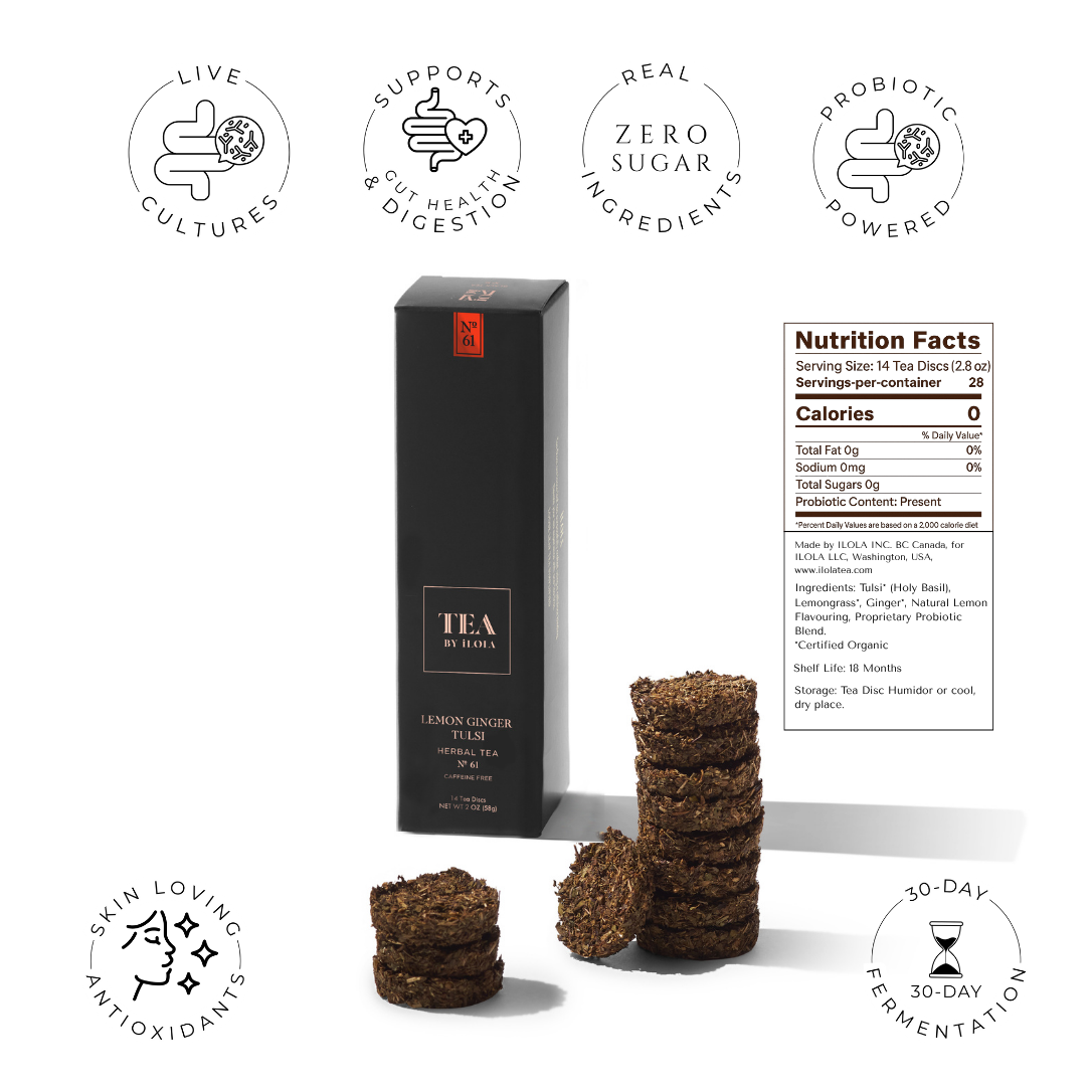 Lemon Ginger Tulsi No. 61 blends the wellness power of Holy Basil with the warming spice of ginger and a bright citrus lift. This caffeine-free herbal tea supports immunity, digestion, and stress balance—perfect when the seasons shift or when your body needs a gentle reset. Infused with probiotics and pressed into compostable Tea Discs for effortless, functional sipping.