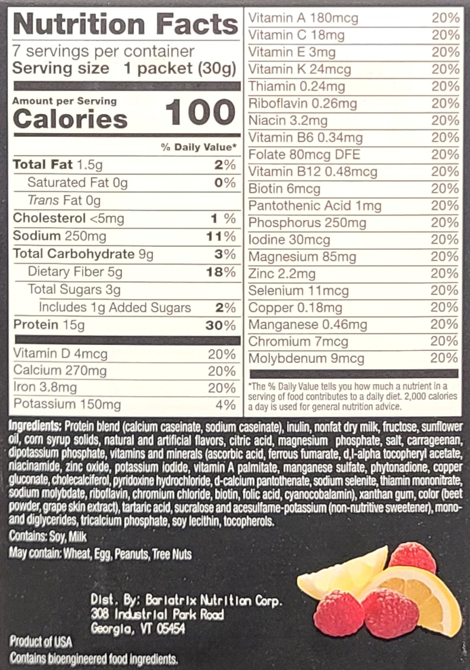 Enjoy the sensation of sweet raspberries mixed with tart lemons in this delicious and fruity shake. The Lemon Raspberry Shake by Proti-Max contains 15g of high quality protein, 5g of fiber, and only 100 calories. This yummy shake is perfect for bariatric and diabetic diets, and can also be made into a creamy pudding.