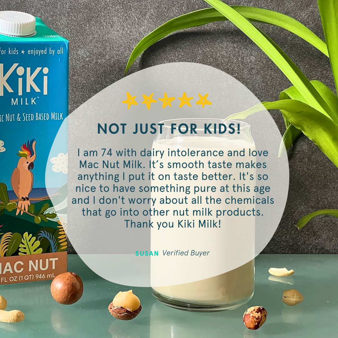 Straight up, Mac Nut Kiki Milk is the BEST macadamia milk on earth! With organic macadamia nuts, brazil nuts and cashews, this velvety nut and seed blend is bursting with real food flavor. Get your daily dose of omega’s, protein and minerals by adding a creamy splash to cereal, coffee, matchas, mochas… or any other way you enjoy your nut milk! Shake, sip, store… and indulge in Mac Nut Kiki Milk in our generous Family Size carton.