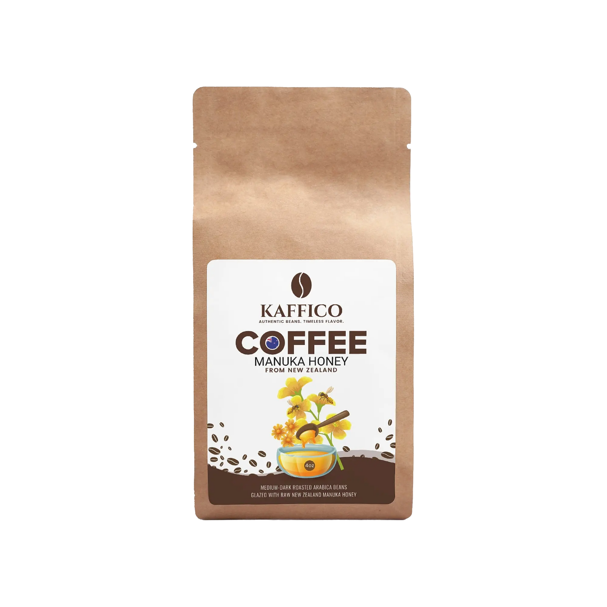 A Naturally Sweet, Honey-Glazed Coffee Experience Manuka Honey Coffee brings together carefully roasted Arabica beans and authentic Manuka honey sourced from New Zealand. The beans are roasted to a medium–dark level to develop richness and depth, then lightly glazed to allow the honey’s natural sweetness to integrate seamlessly rather than overpower the coffee.