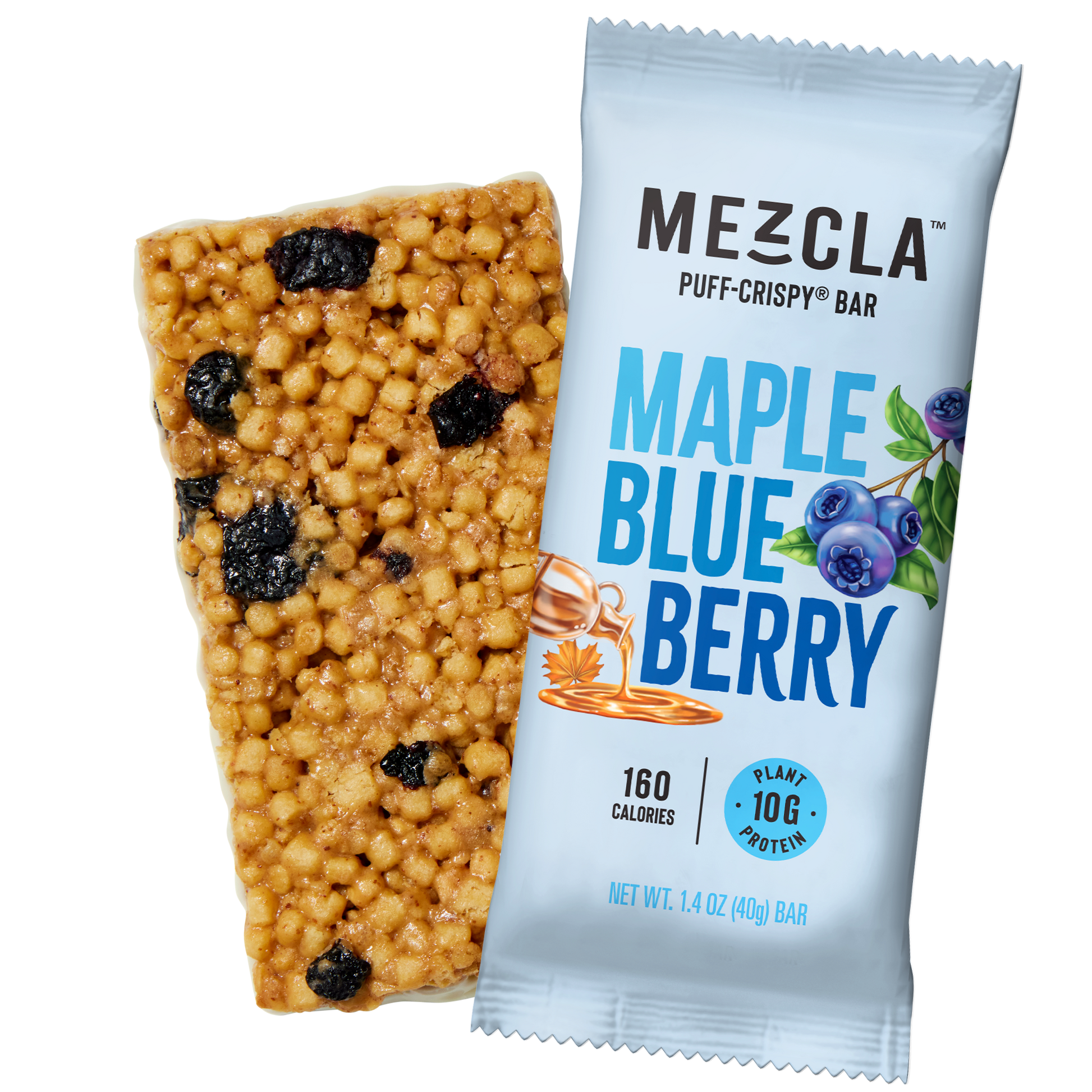 Mezcla Maple Blueberry Bars - 12 bars x 1.4 oz case let’s you take your tastebuds out to brunch! Mezcla Maple Blueberry Puff-Crispy Bar features sweet blueberries, mapley vanilla drizzle, and all the joy of a blueberry pancake on Sunday morning.