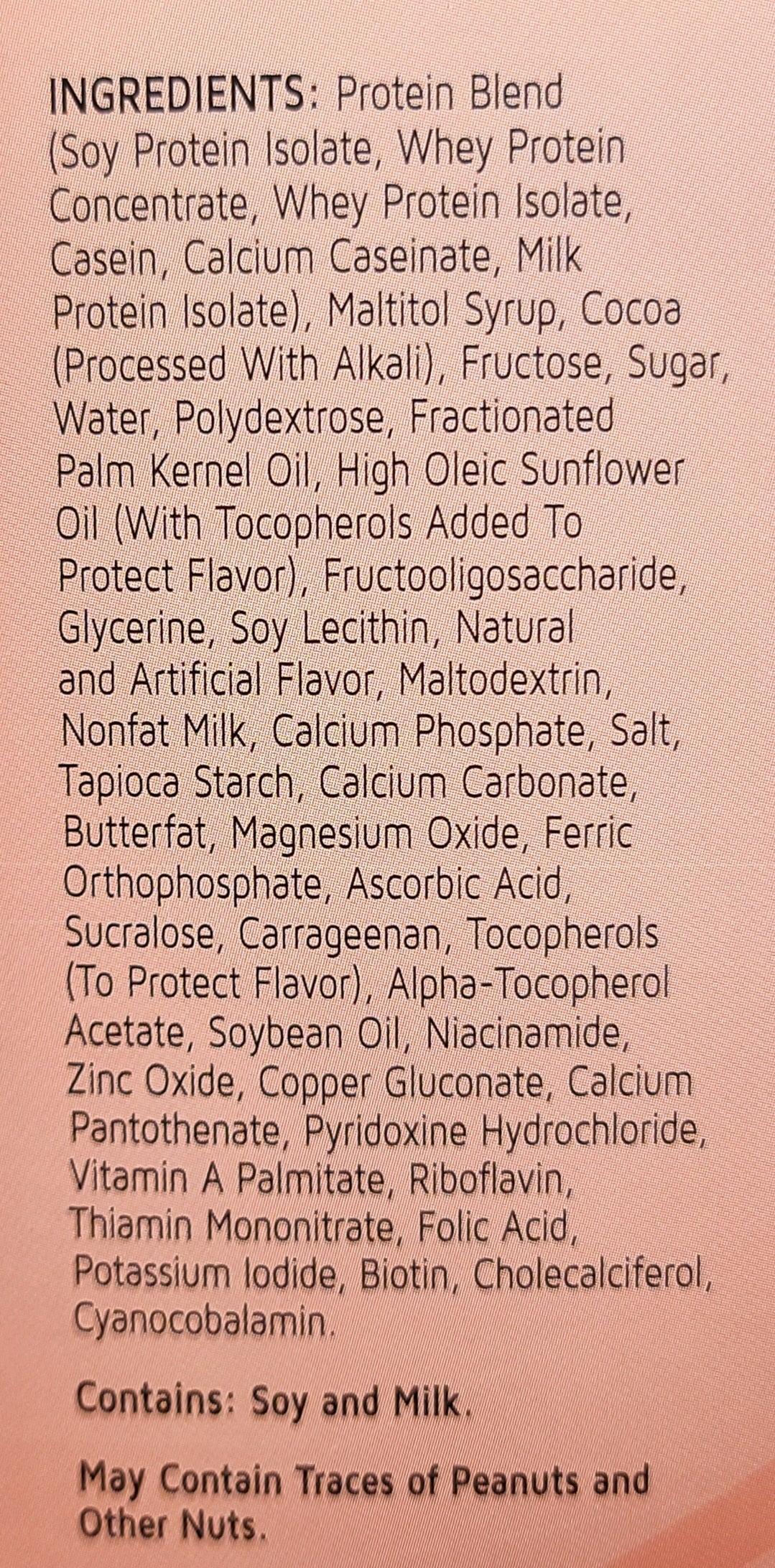 Ingredients: Protein Blend (Soy Protein Isolate, Whey Protein Concentrate, Whey Protein Isolate, Casein, Calcium Caseinate, Milk Protein Isolate), Maltitol Syrup, Cocoa (Processed With Alkali), Fructose, Sugar, Water, Polydextrose, Fractionated Palm Kernel Oil, High Oleic Sunflower Oil (With Tocopherols Added To Protect Flavor), Fructooligosaccharide, Glycerine, Soy Lecithin, Natural and Artificial Flavor, Maltodextrin, Nonfat Milk, Calcium Phosphate, Salt, Tapioca Starch, Calcium Carbonate, Butterfat, Magnesium Oxide, Ferric Orthophosphate, Ascorbic Acid, Sucralose, Carrageenan, Tocopherols (To Protect Flavor), Alpha-Tocopherol Acetate, Soybean Oil, Niacinamide, Zinc Oxide, Copper Gluconate, Calcium Pantothenate, Pyridoxine Hydrochloride, Vitamin A Palmitate, Riboflavin, Thiamin Mononitrate, Folic Acid, Potassium Iodide, Biotin, Cholecalciferol, Cyanocobalamin