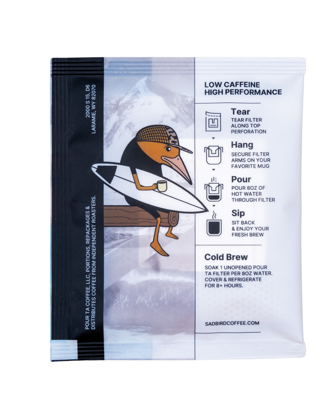 Enjoy great coffee anywhere. Our Sad Bird Pour-Over Packs, available in Decaf and Half-Caff, are an easy, mess free way to savor high quality coffee wherever life takes you. Crafted with specialty-grade beans and designed for simplicity, all you need is a mug and hot water. Whether you're on the road, deep in the backcountry, or just at home, these single-serve packs let you experience exceptional coffee with no hassle.