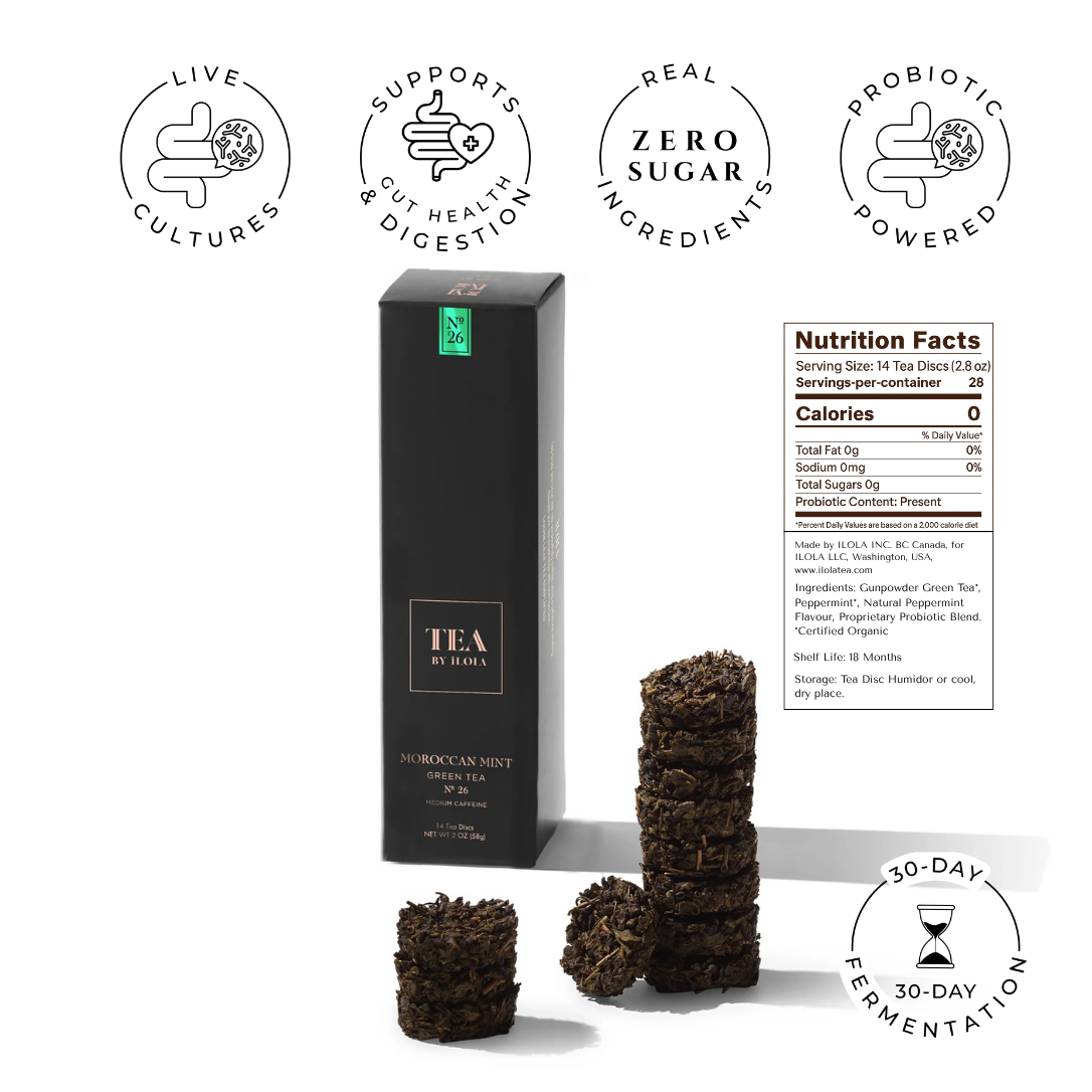 Moroccan Mint No. 26 is a crisp, centering blend inspired by North African tea traditions. Smooth green tea and cool peppermint come together to refresh the palate and support digestion. Infused with probiotics and pressed into compostable Tea Discs, it’s perfect after meals or whenever you need a mindful moment.