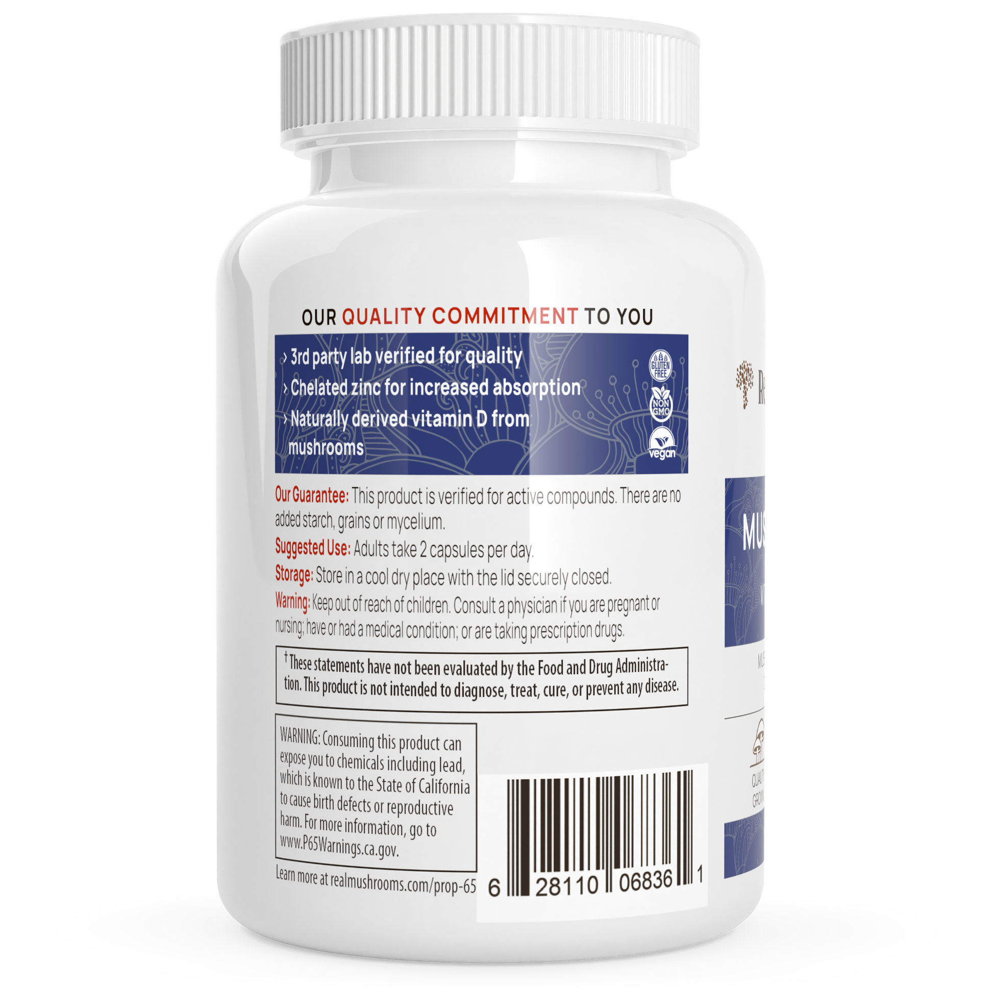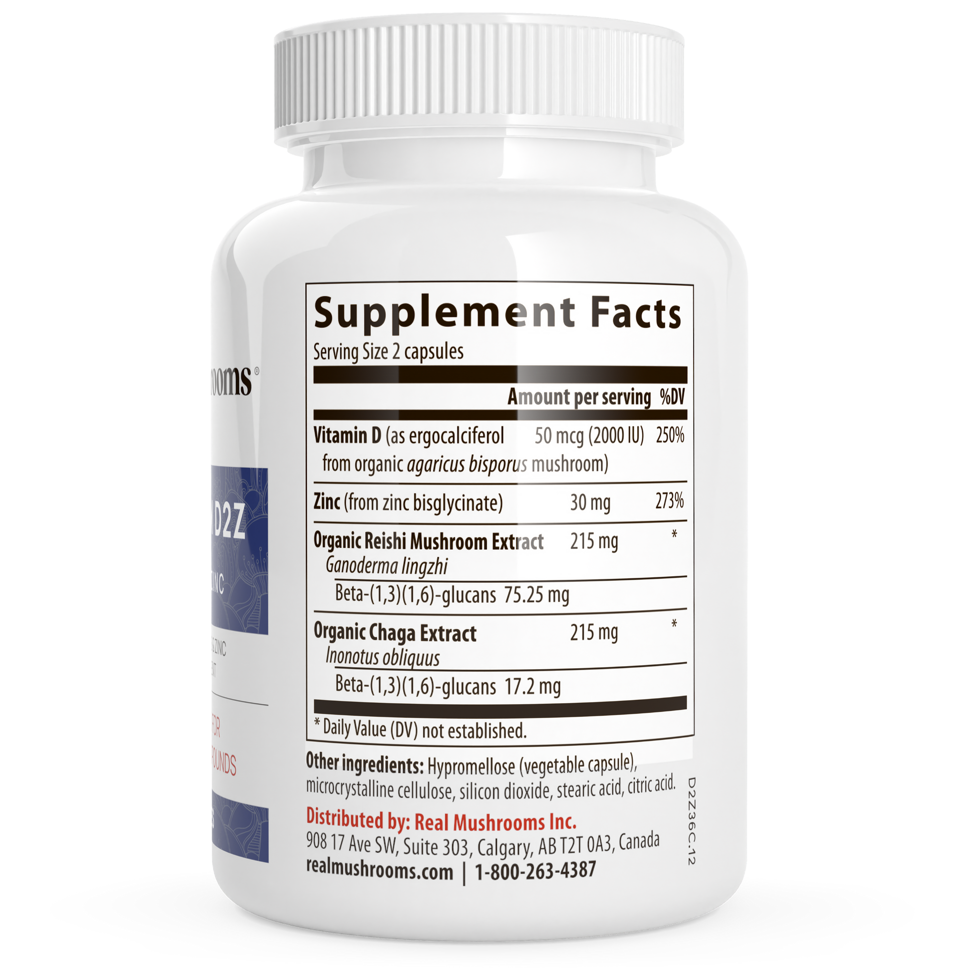 - A blend of organic extracts of Reishi mushroom and Chaga plus Zinc and Vitamin D