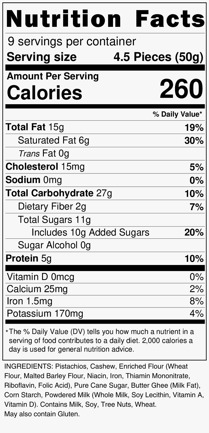6 Clean, high-quality, all-natural ingredients: Premium pistachio and cashew, wheat flour, real cane sugar, butter ghee, corn starch, and milk.