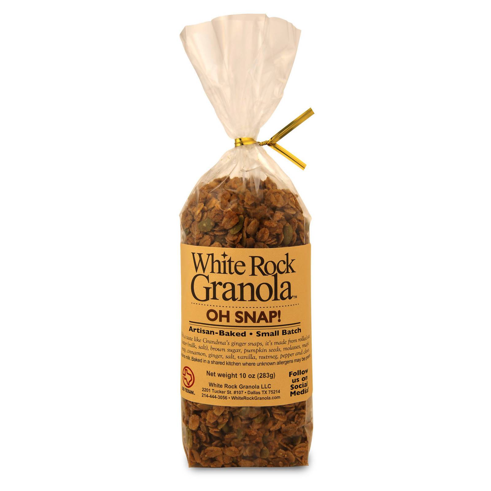 White Rock Granola likes to question who says you can't have gingersnaps for breakfast? With a sweet taste like Grandma's gingersnaps, Oh Snap! granola features a blend of maple syrup, crunchy pumpkin seeds, and all your favorite seasonal spices. If Grandma only knew!