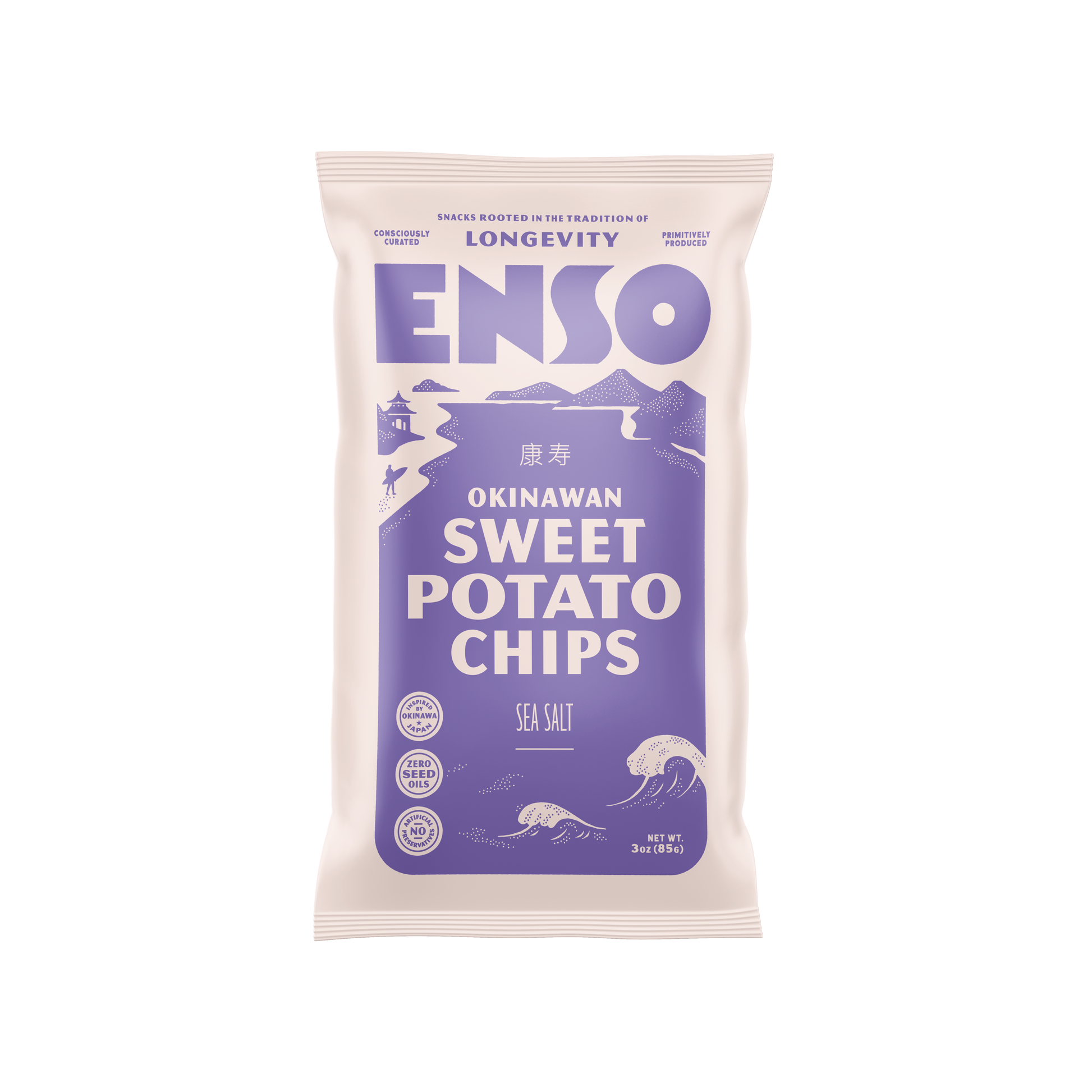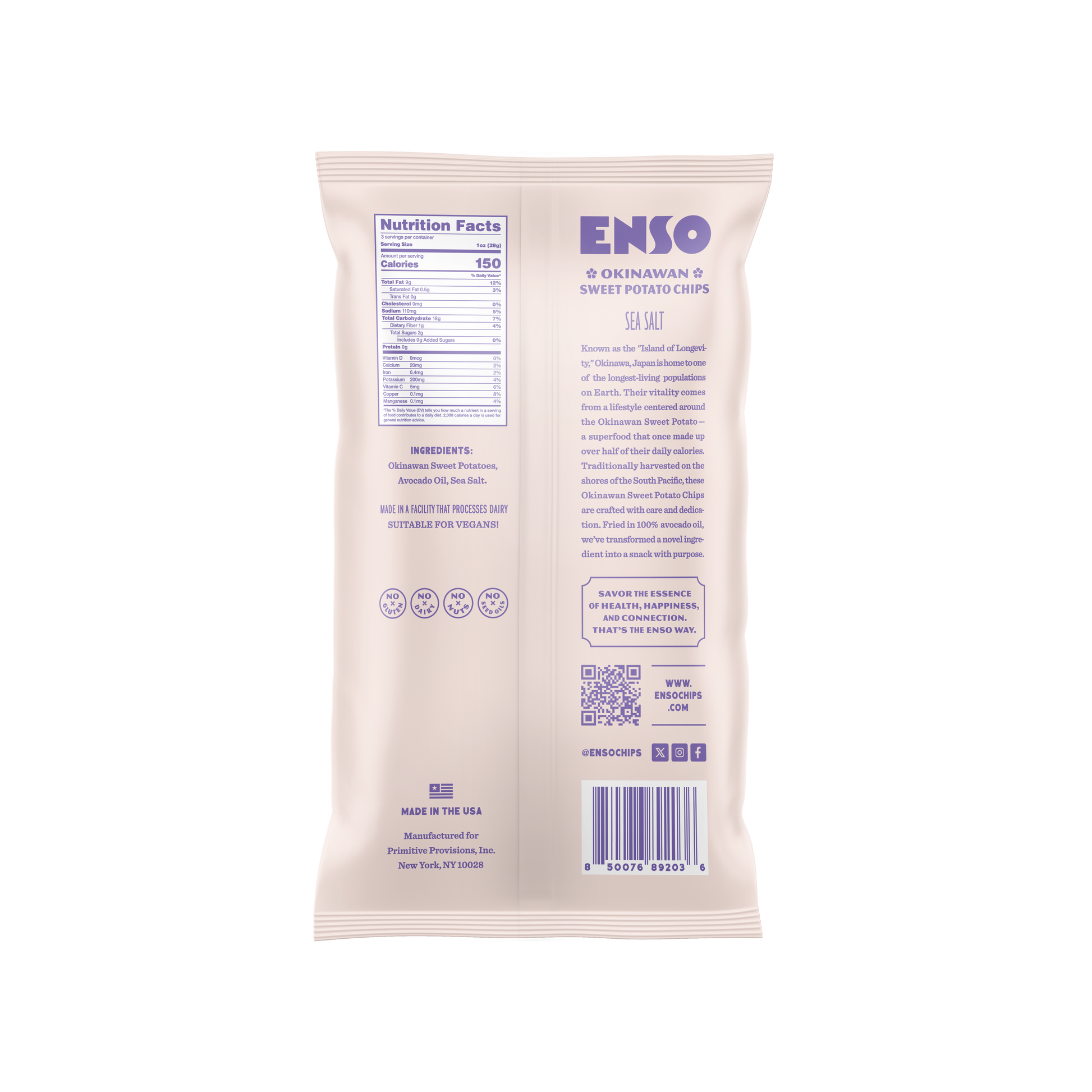 Experience pure, simple snacking with Enso Okinawan Sweet Potato Chips in Sea Salt. Made with just three clean ingredients - Okinawan sweet potatoes, avocado oil, and sea salt - these chips deliver a naturally sweet, earthy flavor with a light, crispy crunch. Inspired by the longevity traditions of Okinawa, Japan, each bite celebrates mindful, wholesome eating. Fried in 100% avocado oil, these chips are vegan, gluten-free, non-GMO, and free from artificial additives. Perfect for healthy snacking, post-workout refueling, or sharing on the go.