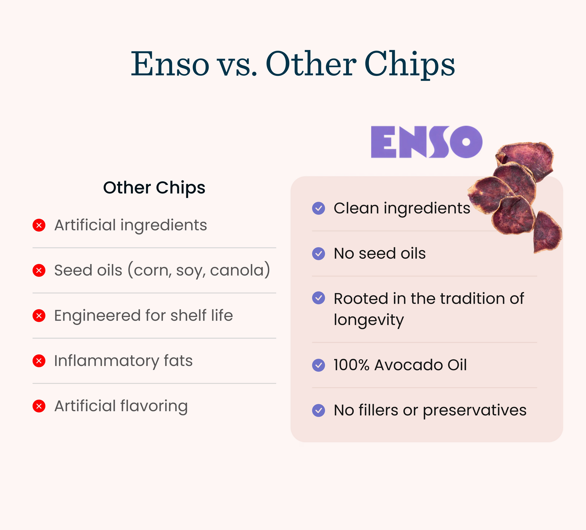 Enso Chips are fried in 100% Avocado oil, a healthier alternative to the highly processed seed oils used in most chips, offering a delicious and wholesome crunch you can feel good about.