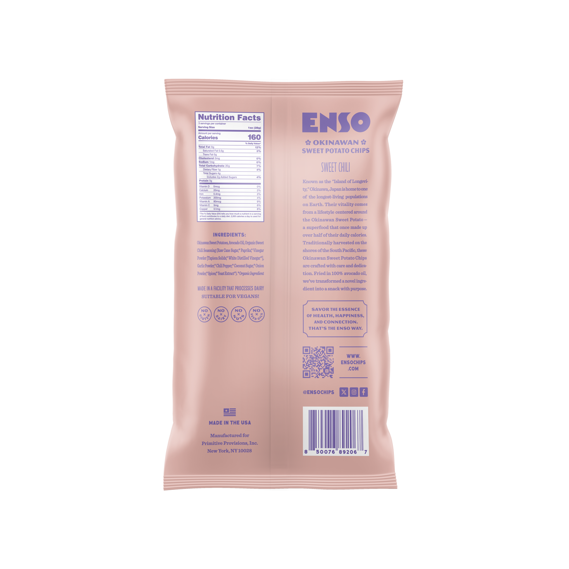 Turn up the flavor with Enso Okinawan Sweet Potato Chips in Sweet Chili. Combining the natural sweetness of Okinawan sweet potatoes with a bold, tangy chili kick, these chips offer the perfect balance of spice and crunch. Made with only clean, real ingredients - no preservatives, no seed oils, and nothing artificial - these chips are a better-for-you option that fits vegan, gluten-free, paleo, and Whole30 lifestyles. Inspired by Okinawa, Japan, where nourishment and longevity are a way of life, Enso chips embody wellness and flavor in harmony. Enjoy them as a nutritious snack, paired with dips, or straight from the bag.