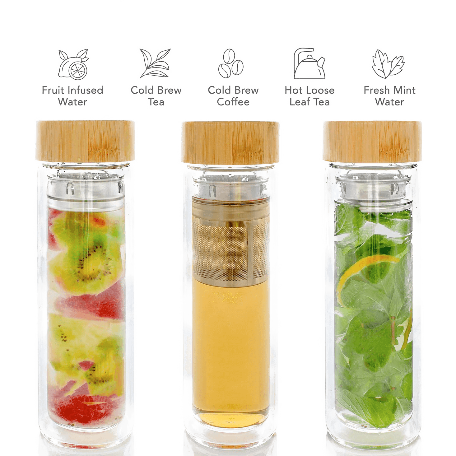 Open Door Tea Bamboo Tea Tumbler by Open Door Tea wholesale product delivery near me | | Fulfilled by our friends at Open Door TeaThe Tea Tumbler:This double-wall glass bottle is a beautiful drink infuser and travel bottle. The built-in steel basket holds your tea (or coffee) for easy hot or cold brewing. This bottle comes with a neoprene carrying case and handle - offering sturdy protection and even better temperature insulation on the road. The tumbler fits inside a standard car cup holder, so no more worrying about spilling the tea.This glass bottle is also great for making and serving ginger or mint teas and fruit infused waters. The steel infuser is easily removable for cleaning, and the tumbler holds 400 mL (about 1.7 cups).INSTRUCTIONS:Remove lid and infuser.Twist the infuser top open.Add 2-3 teaspoons of tea. You can experiment with different quantities for different herbs.Twist infuser lid on and push into glass.Pour water slowly until it surrounds the infuser.Af..