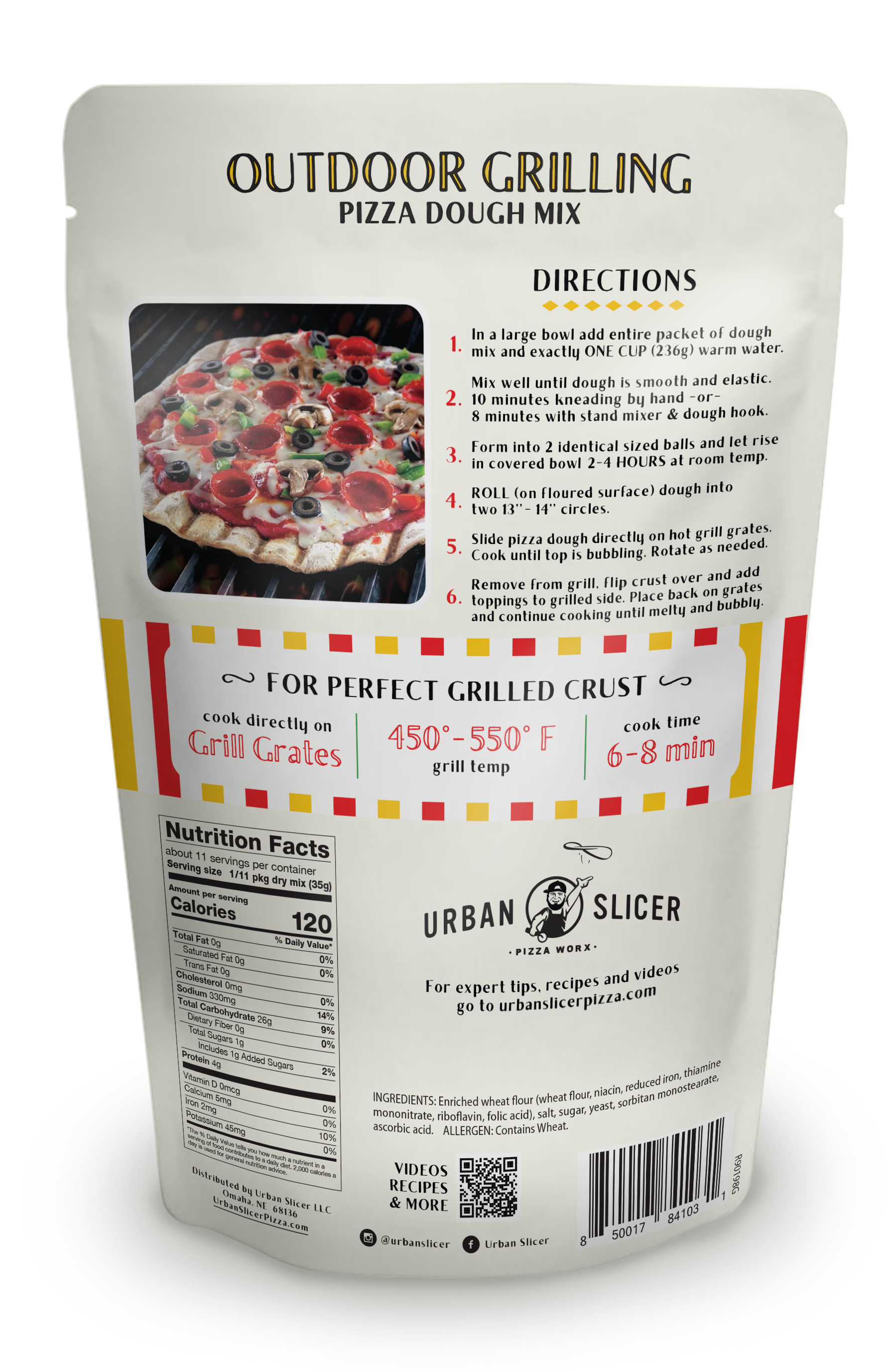 Urban Slicer's Outdoor Grilling Dough is our lowest gluten blend, which lends well to those awesome Thin 'n Crispy pizzas. It works perfectly for pizzas, calzones, pizza rolls, flour tortillas and so much more.