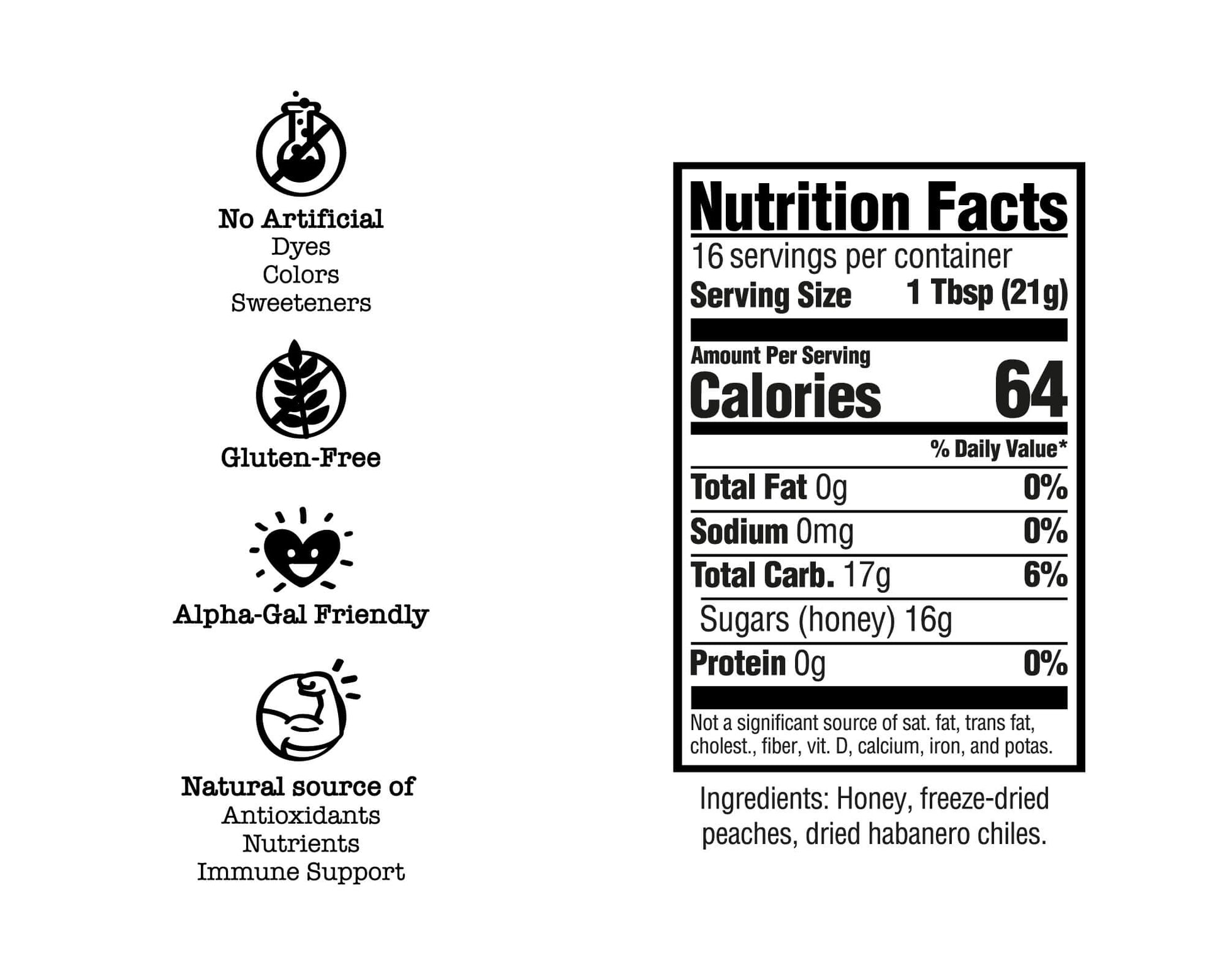 You'll love that sweet peach flavor on your tongue before the habanero heat hits you in 5, 4, 3, 2, 1. This is unlike any hot honey you've tasted before.