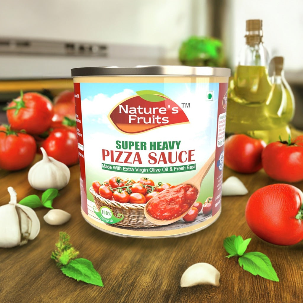Crafted from premium vine-ripened Roma tomatoes, Nature’s Fruits Pizza Sauce Super Heavy is a dense, thick-bodied sauce designed for maximum coverage and rich tomato intensity. Its deep natural red color, robust aroma, and concentrated texture make it ideal for pizzas that require a heavier, fuller sauce layer without watering down the crust.
