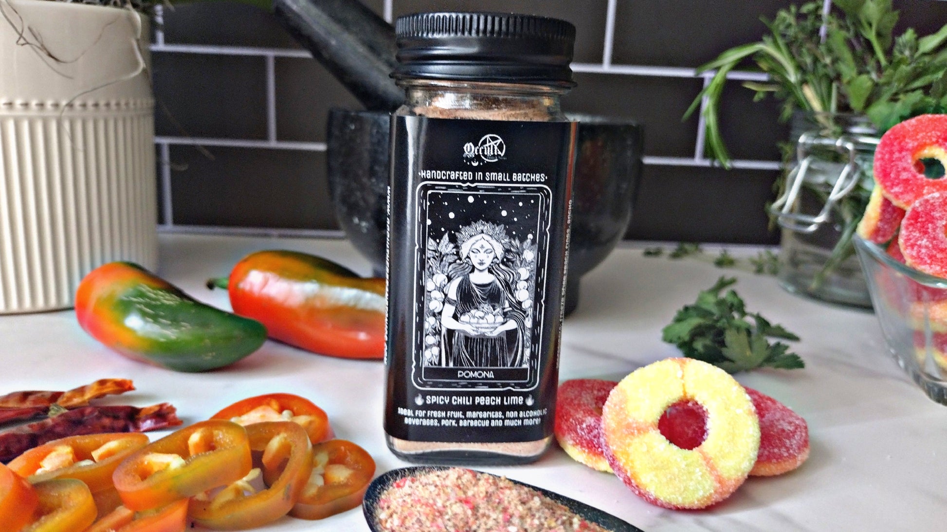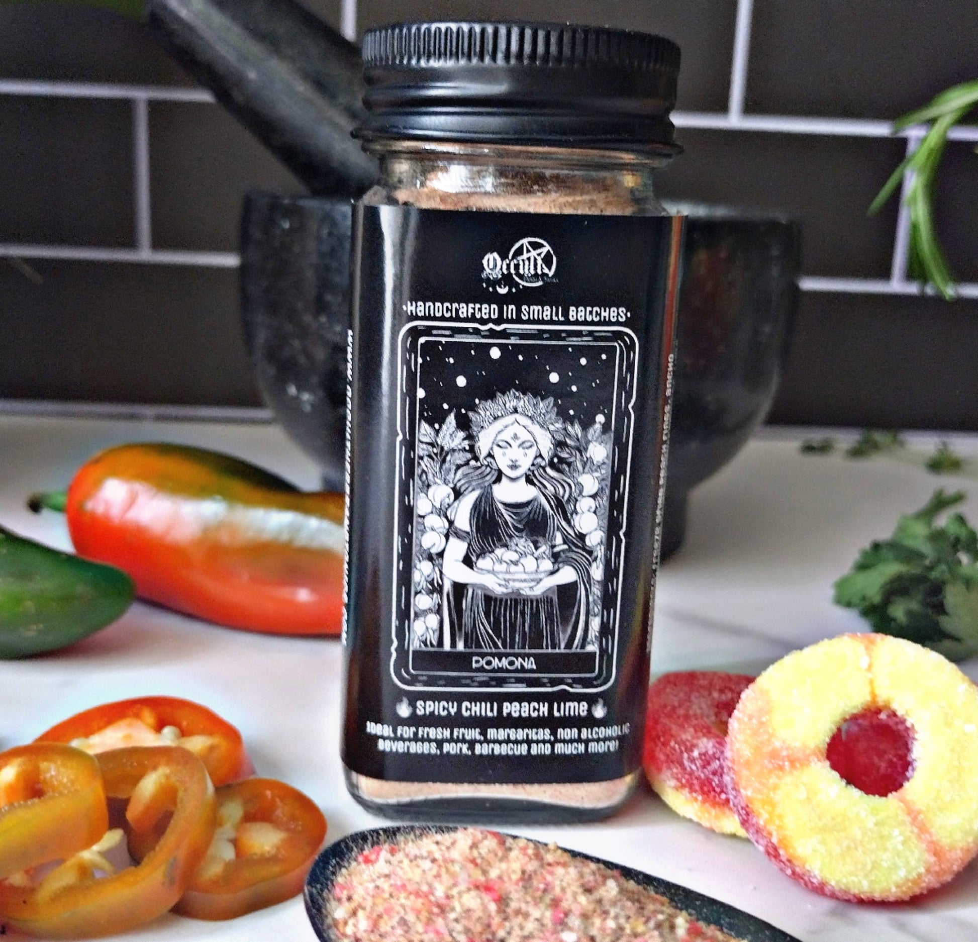 Summon the orchard’s bounty with this enchanting blend of freeze-dried peach rings, three fiery chili peppers (ancho, mecho, and cayenne), and a whisper of lime. Named for Pomona, the Roman goddess of fruit and harvest, this blend honors her gifts of ripening orchards, abundance, and sweet temptation. Each sprinkle awakens the senses — a burst of sun-kissed fruit followed by a smoky, spellbinding heat. Perfect for bewitching margaritas, stirring into barbecue sauces, or casting a little magic over fresh-cut watermelon. Open a jar and channel the goddess of the grove in every bite.