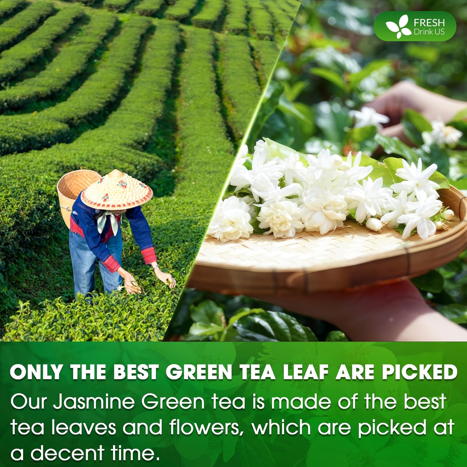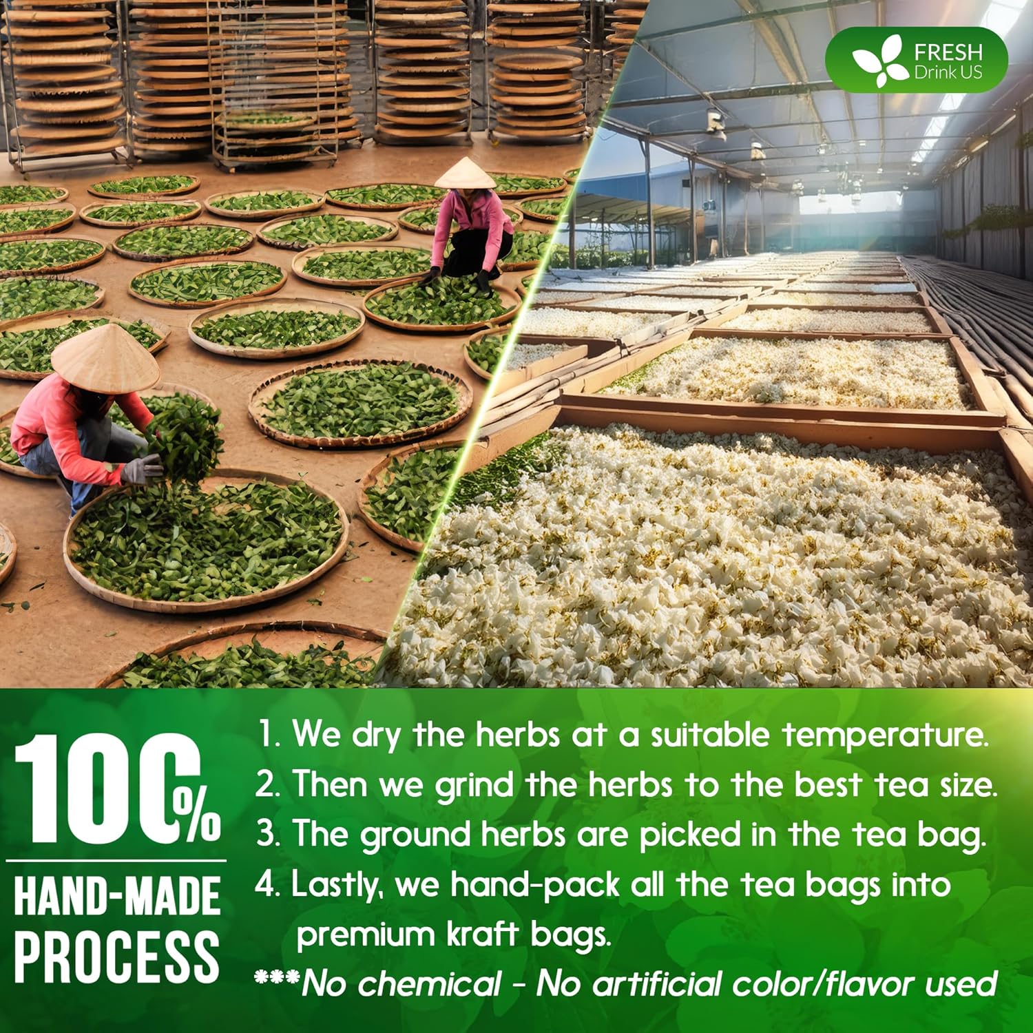 Premium Jasmine Green Tea Bags. Jasmine Green Herbal Tea. Made with Natural Material Tea Bags. No Sugar, No Gluten, Vegan.