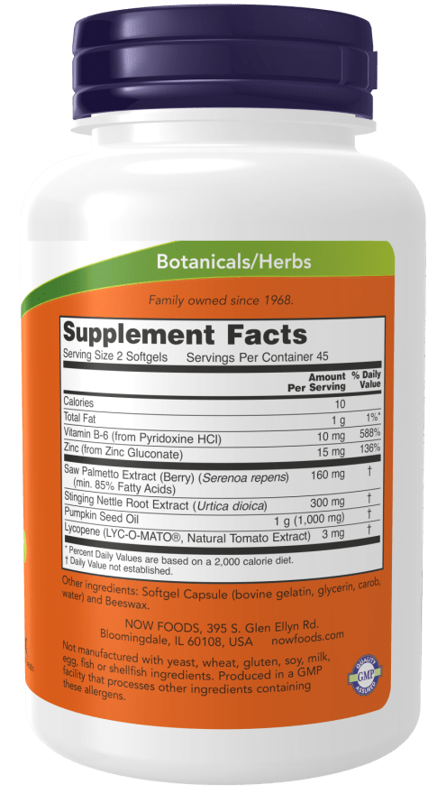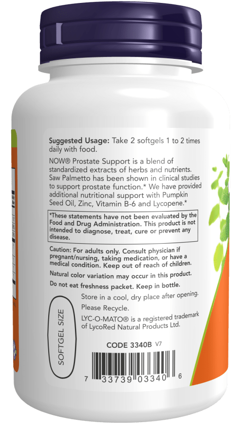 NOW® Prostate Support is a blend of standardized extracts of herbs and nutrients. Saw Palmetto has been shown in clinical studies to support prostate function.* We have provided additional nutritional support with Pumpkin Seed Oil, Zinc, Vitamin B-6 and Lycopene.*