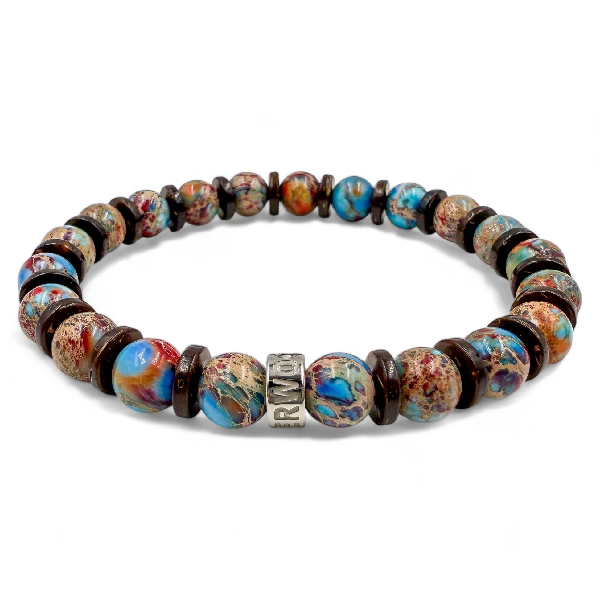 Light it up with Americana Spark—a bracelet that’s all about bold pride and grounded style. Featuring vibrant red, white, and blue tones from Patriot Jasper beads, paired with warm brown coconut wood, this piece captures the spirit of adventure and the grit of American roots. Finished with a polished stainless steel spacer engraved with the EVERWOOD name, it’s a clean and confident nod to freedom and individuality. From backyard barbecues to everyday grind, Americana Spark brings color, character, and timeless edge to your wrist.