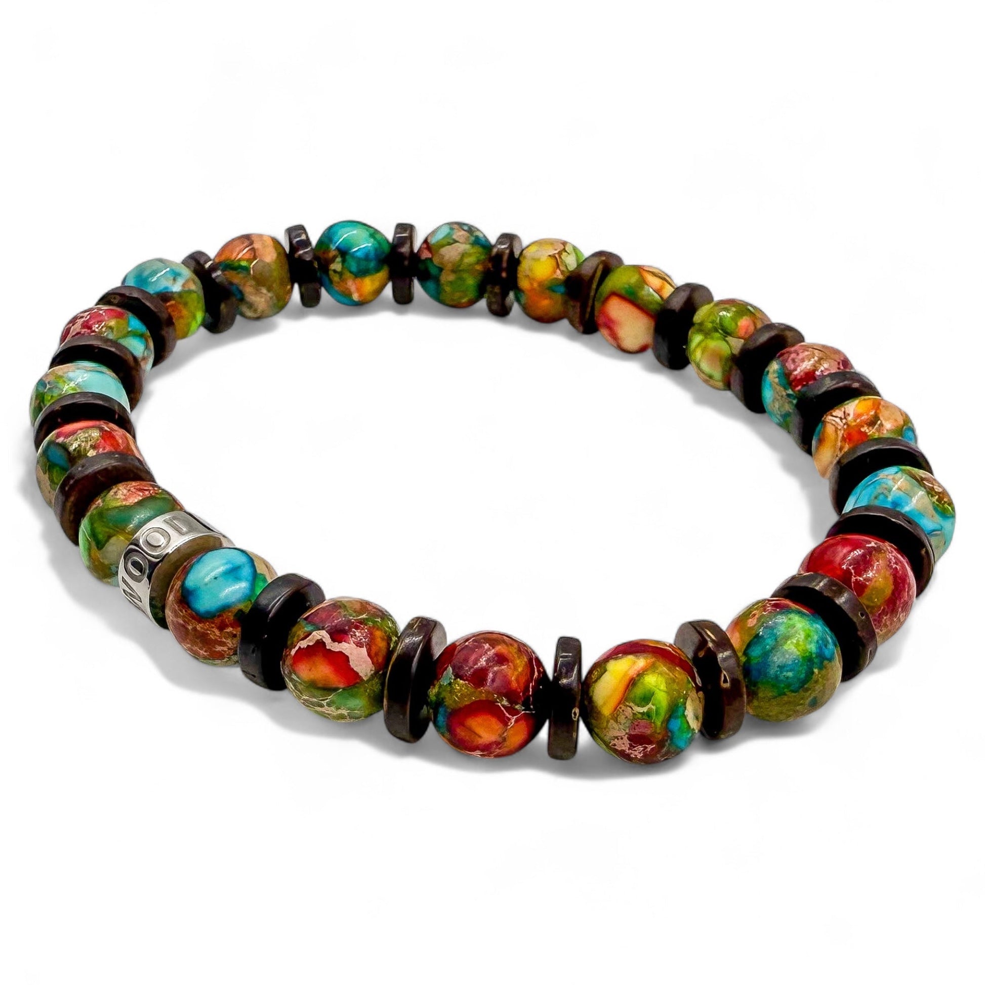 Turn heads without saying a word. The Jungle Fiesta bracelet is all about bold color and natural style. With vibrant rainbow jasper beads bringing the energy and warm brown coconut wood adding that earthy balance, this piece is like a tropical escape for your wrist. The polished silver stainless steel spacer—engraved with the EVERWOOD name—adds a clean, premium finish. Perfect for summer vibes, weekend getaways, or just breaking up the black-and-grey wardrobe, Jungle Fiesta brings personality and punch to your everyday carry.