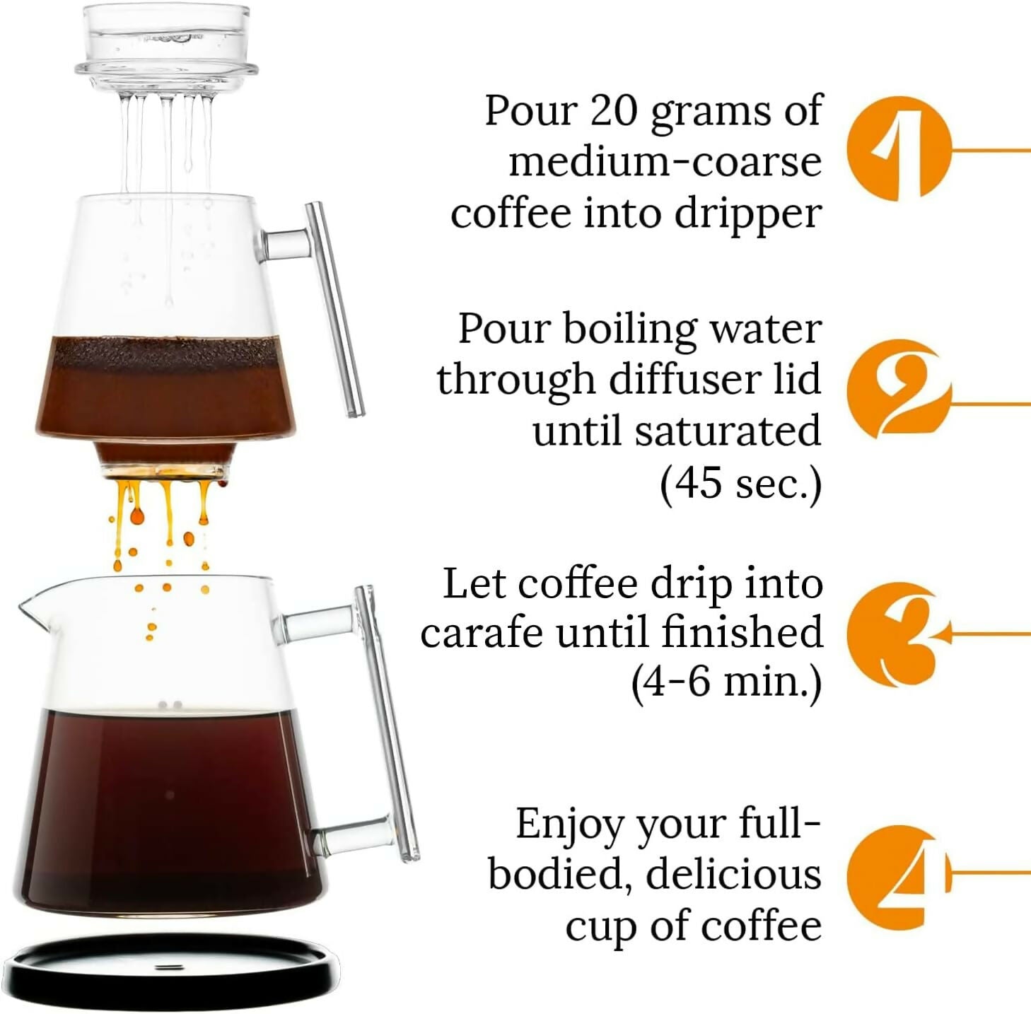 * Includes: Dripper, Diffuser Lid, Dripper Ceramic Base, Stir Stick, Carafe & Carafe Ceramic Coaster