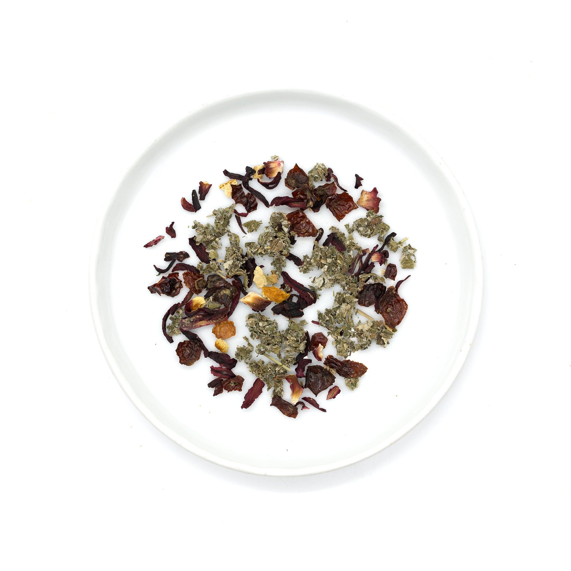 This tart pink herbal tea blend is inspired by sour ale and Nordic-style coffee roasts, known for their fruit-forward notes with high levels of malic acidity. The steeped cup presents a vivid pink hue with smooth hibiscus flower and juicy rose hip pods creating warm floral aromas until the stimulating bright tartness of raspberry leaf hits your taste buds with a lingering citrusy finish. Naturally caffeine free, rich in antioxidants, and very pink. Try this tea iced with sweetener for a refreshing pink drink.