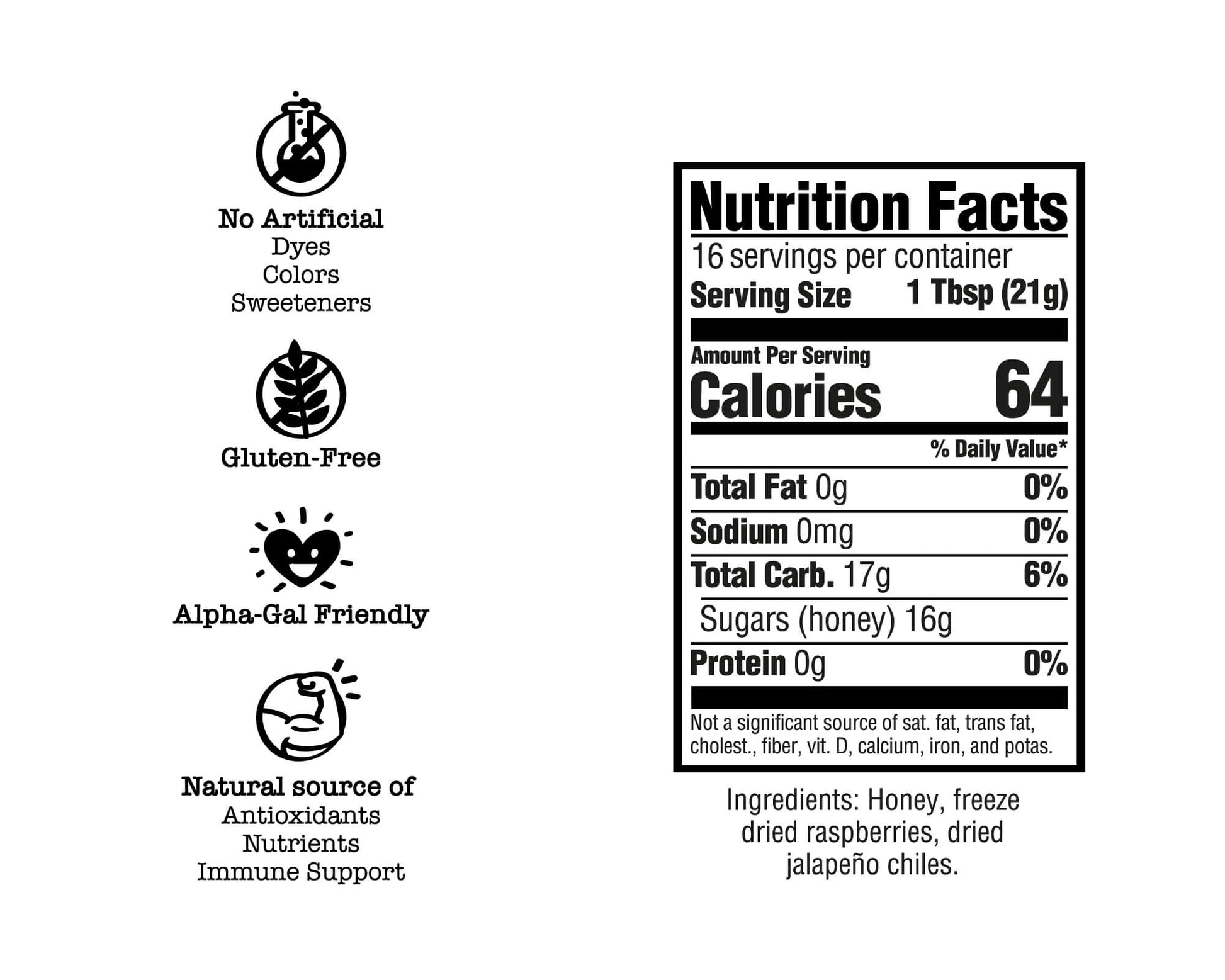 Your hot honey is within reach with our raspberry jalapeno drizzler, filled with real raspberries and jalapenos! With our unique blend the sweetness of raspberries greets you while the heat catches up on the back end.
