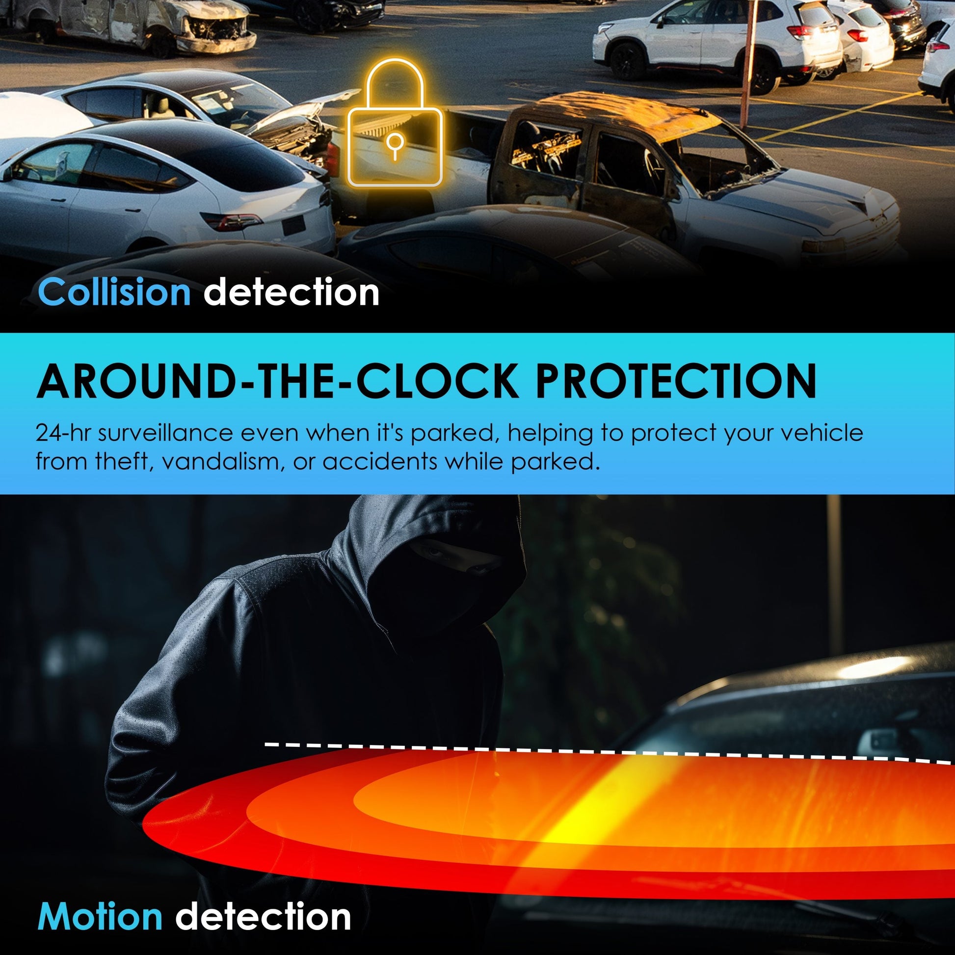 - 24/hr Parking Mode – Enhance security with the parking mode feature, utilizing motion and impact detection to automatically start recording when any movement or impact is detected around your vehicle. Capture incidents for review, whether from attempted break-ins or parking lot accidents.