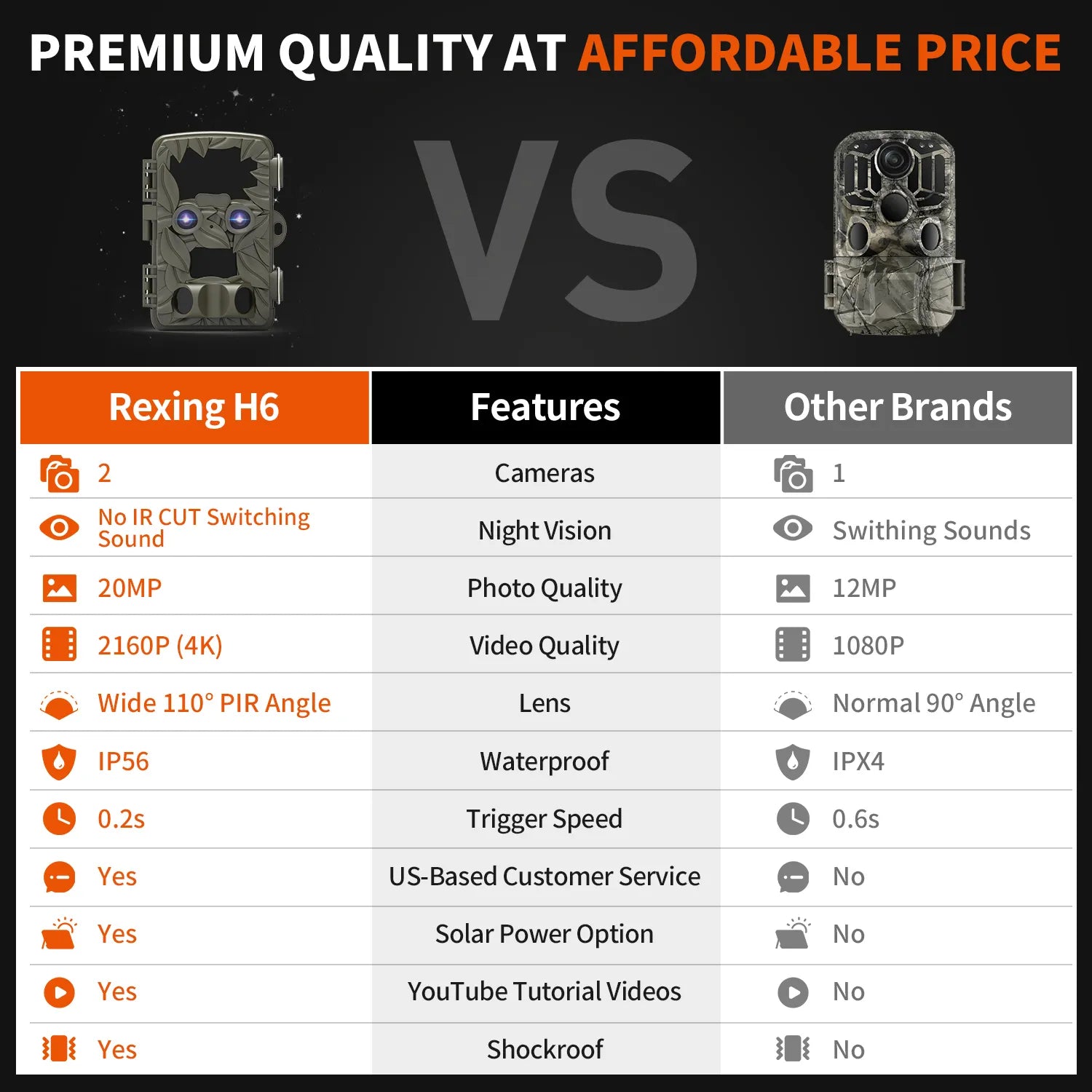 - DUAL CAMERA - Rexing H6 captures video using two cams, 4K Ultra HD optimized for the day, and an FHD Infrared cam at night with simultaneous audio recording. No IR CUT switching sound so animals aren’t scared away during the day/night time change.