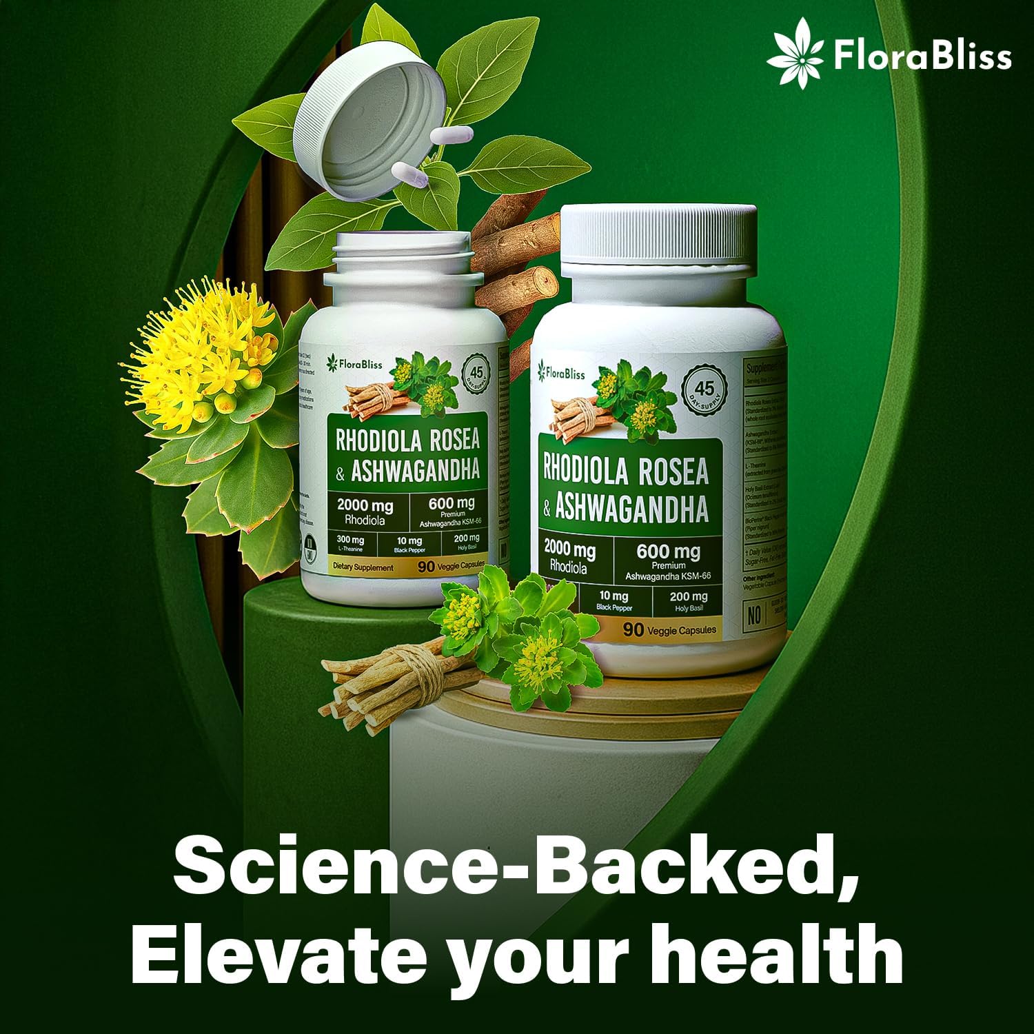 - Natural Blend: Rhodiola Rosea 2000mg whole root equivalent from 500mg extract (3% Rosavins, 1% Salidrosides), 600mg Organic KSM-66 Ashwagandha, and 300mg Holy Basil