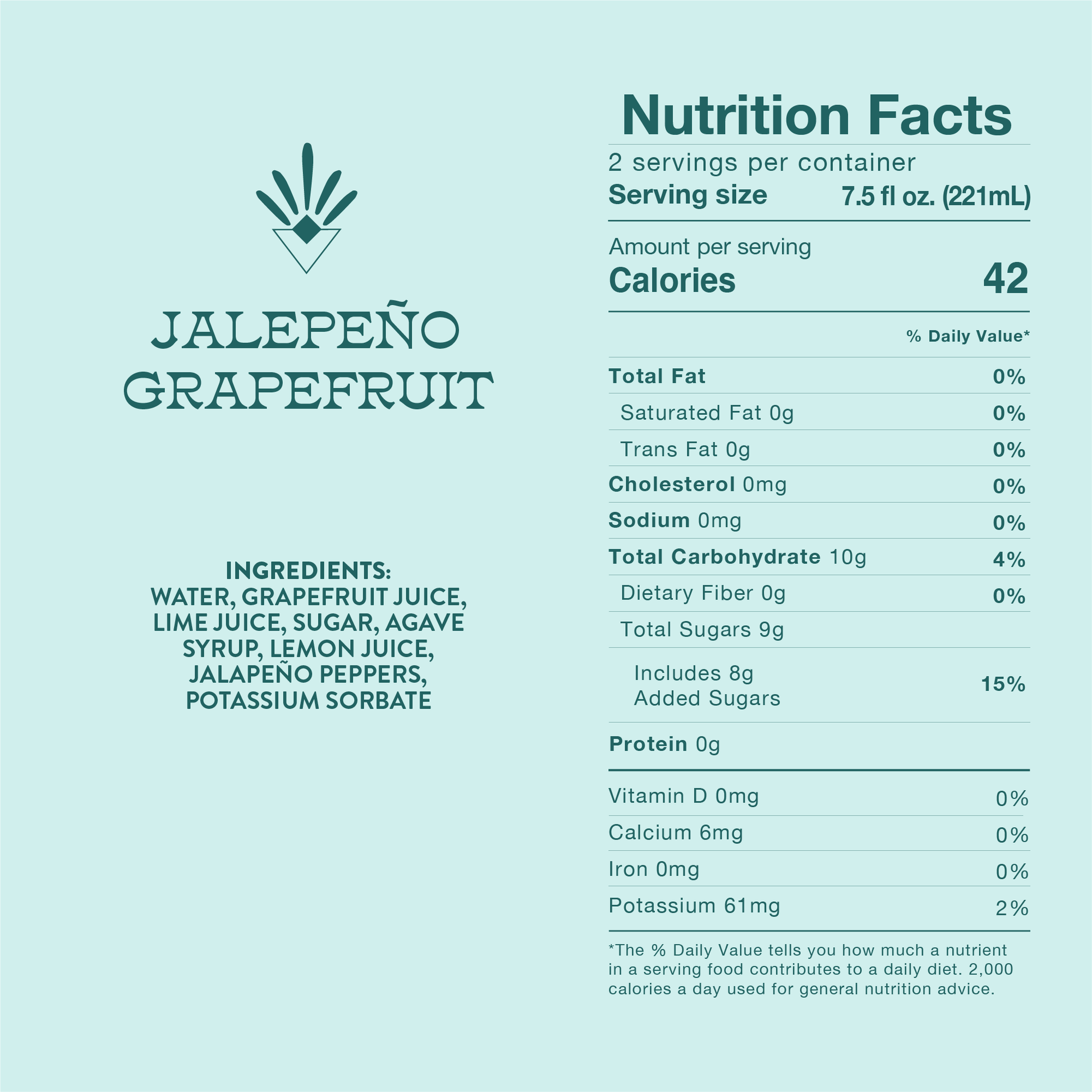 - All Natural Ingredients: Crafted with artisanal alchemy, our Grapefruit Jalapeño mixer features the freshest ingredients: Water, Grapefruit Juice, Lime Juice, Sugar, Agave Syrup, Lemon Juice, Jalapeño Peppers, and Potassium Sorbate.