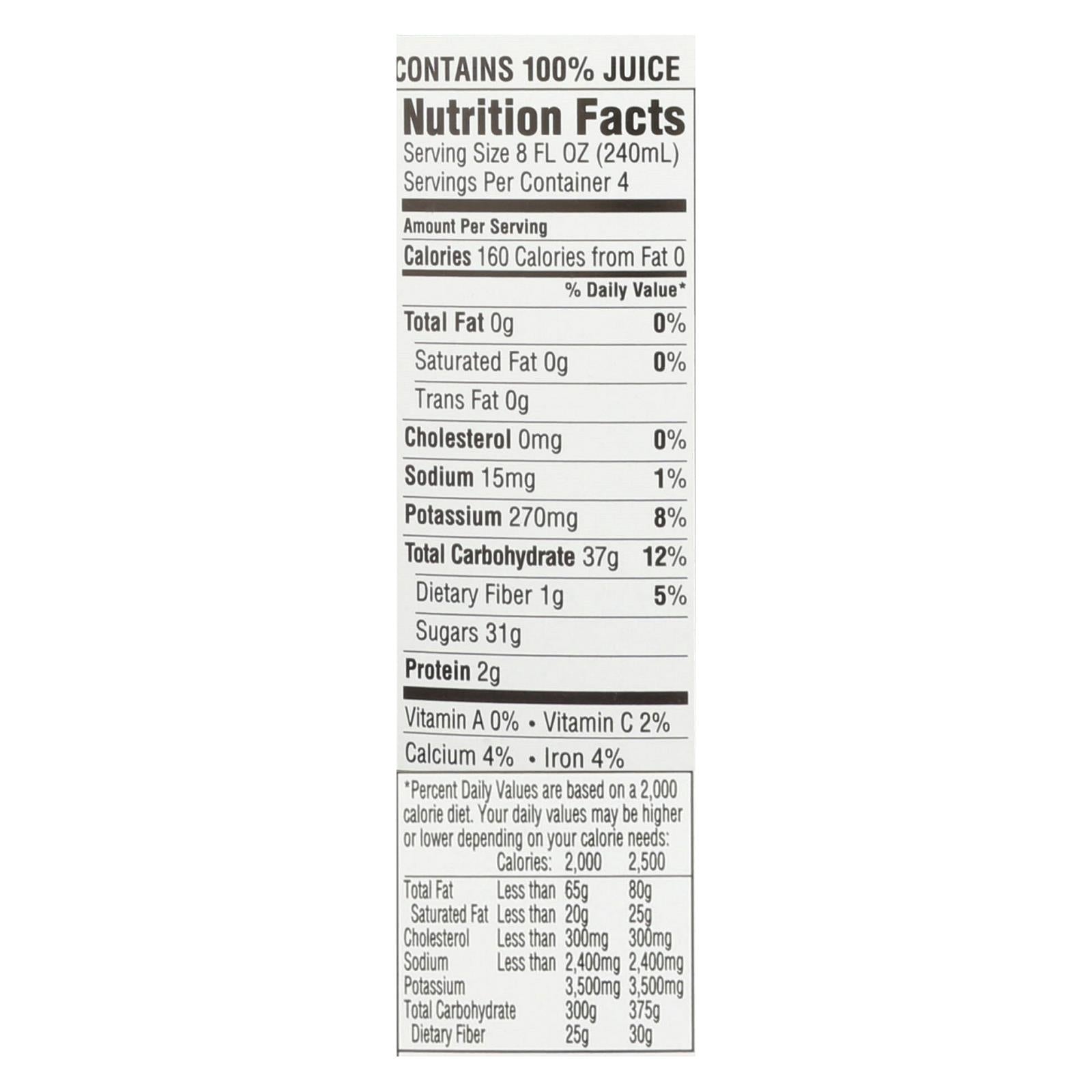 RW KNUDSEN ORGANIC JUST CONCORD JUICE IS MADE FROM 100% JUICE CONCENTRATE WITH INGREDIENTS INCLUDING ORGANIC CONCORD GRAPES. EVERY 32 FL. OZ. BOTTLE IS ORGANIC AND UNSWEETENED AND MADE WITHOUT PRESERVATIVES OR ARTIFICIAL FLAVORS. THERE ARE ONLY 160 CALORIES IN EVERY SERVING AND EVERY BOTTLE CONTAINS APPROXIMATELY FOUR SERVINGS.
