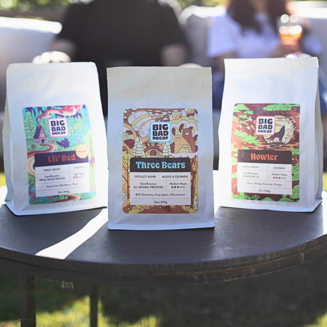 Try our three favorite decaf coffees in this Sampler Pack. It includes the Howler Decaf Single Origin from Colombia that is Sugarcane EA Decaffeinated; the Three Bears Signature Blend with three beans from Colombia & Mexico that is MWP Decaffeinated; and the Limited Release Lil' Red Decaf Single Origin from Ethiopia that is Swiss Water Press Decaffeinated