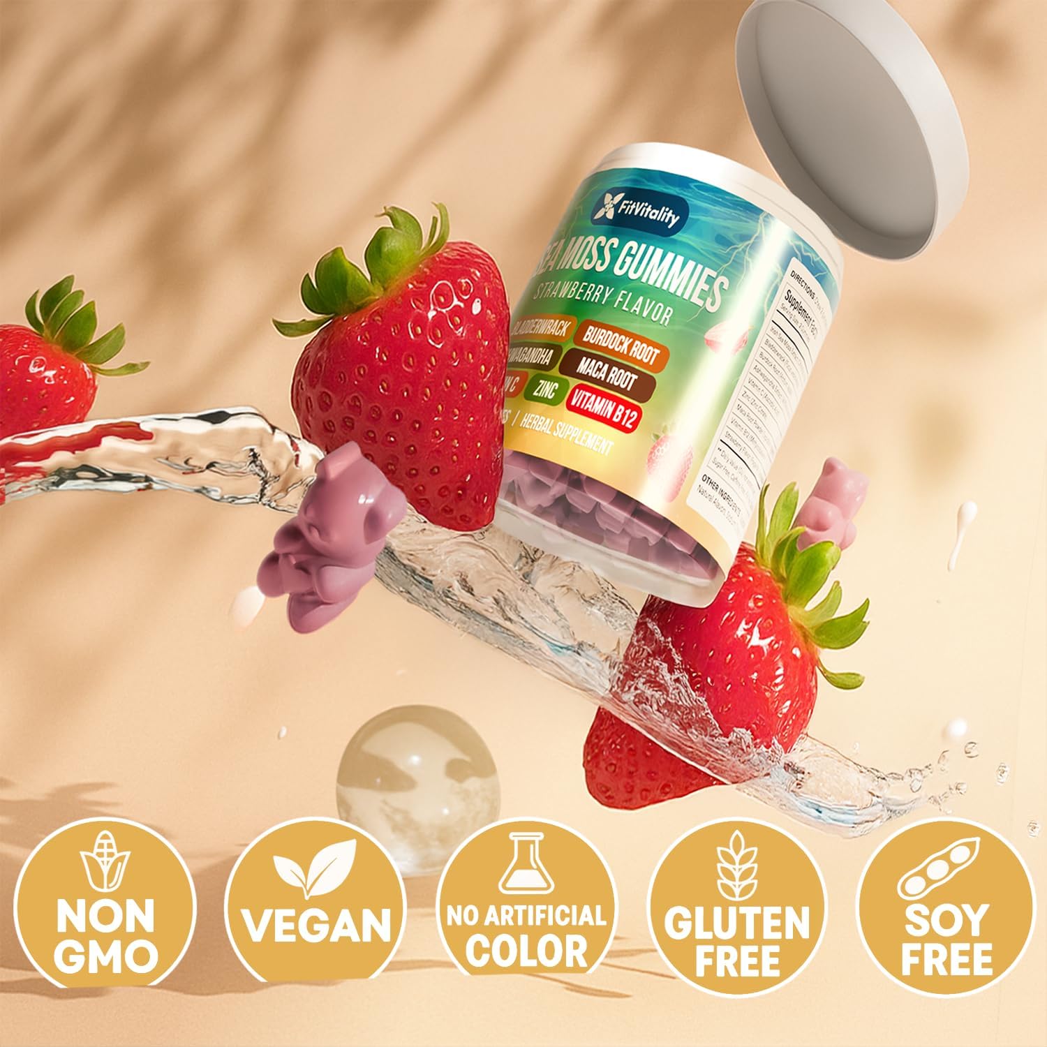 Sea Moss Gummies | Strawberry Flavor Vegan Gummies | Extra Rich 9-in-1 Formulation with Irish Sea Moss, Elderberry, Bladderwrack, Burdock, Ashwagandha, Maca, Zinc, B12 | Energy & Immune Support
