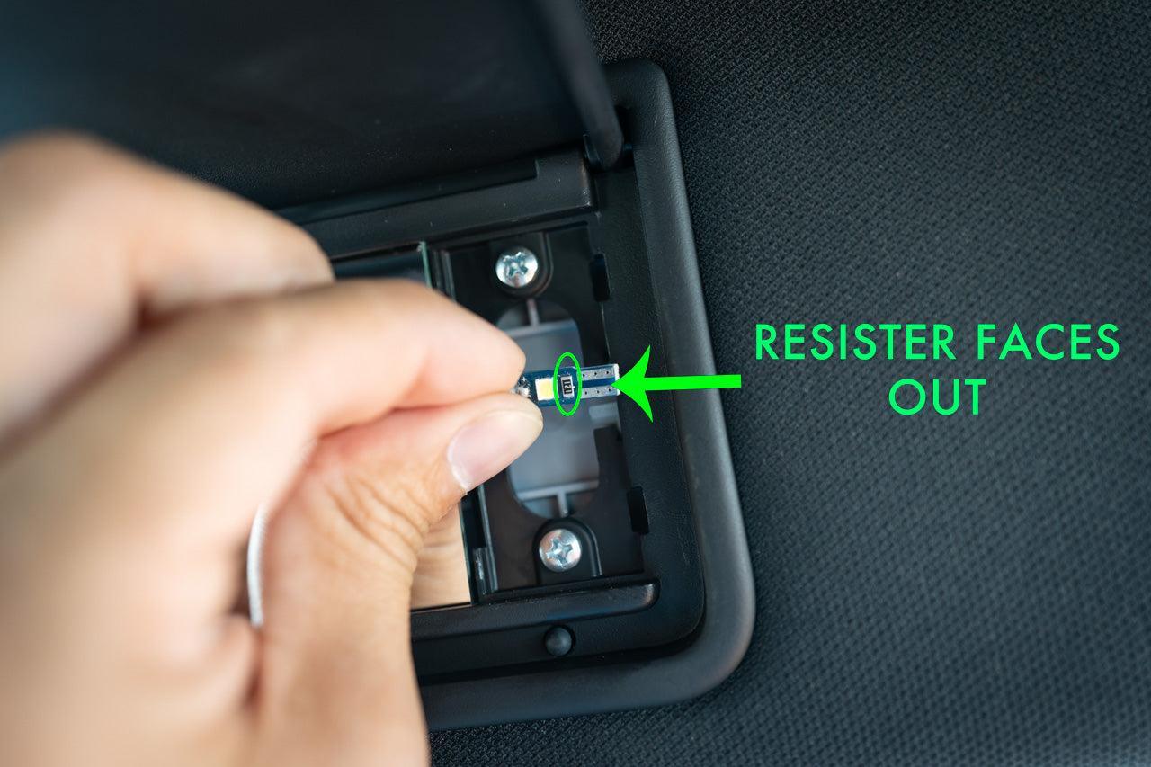 The outer portion of the white cover can be pulled up with your fingers (side opposite the side touching the mirror). Use a small screwdriver and carefully push out the OEM bulb. Replace with our bulb and make sure the resistor faces out. Check out our photos in the main slideshow.