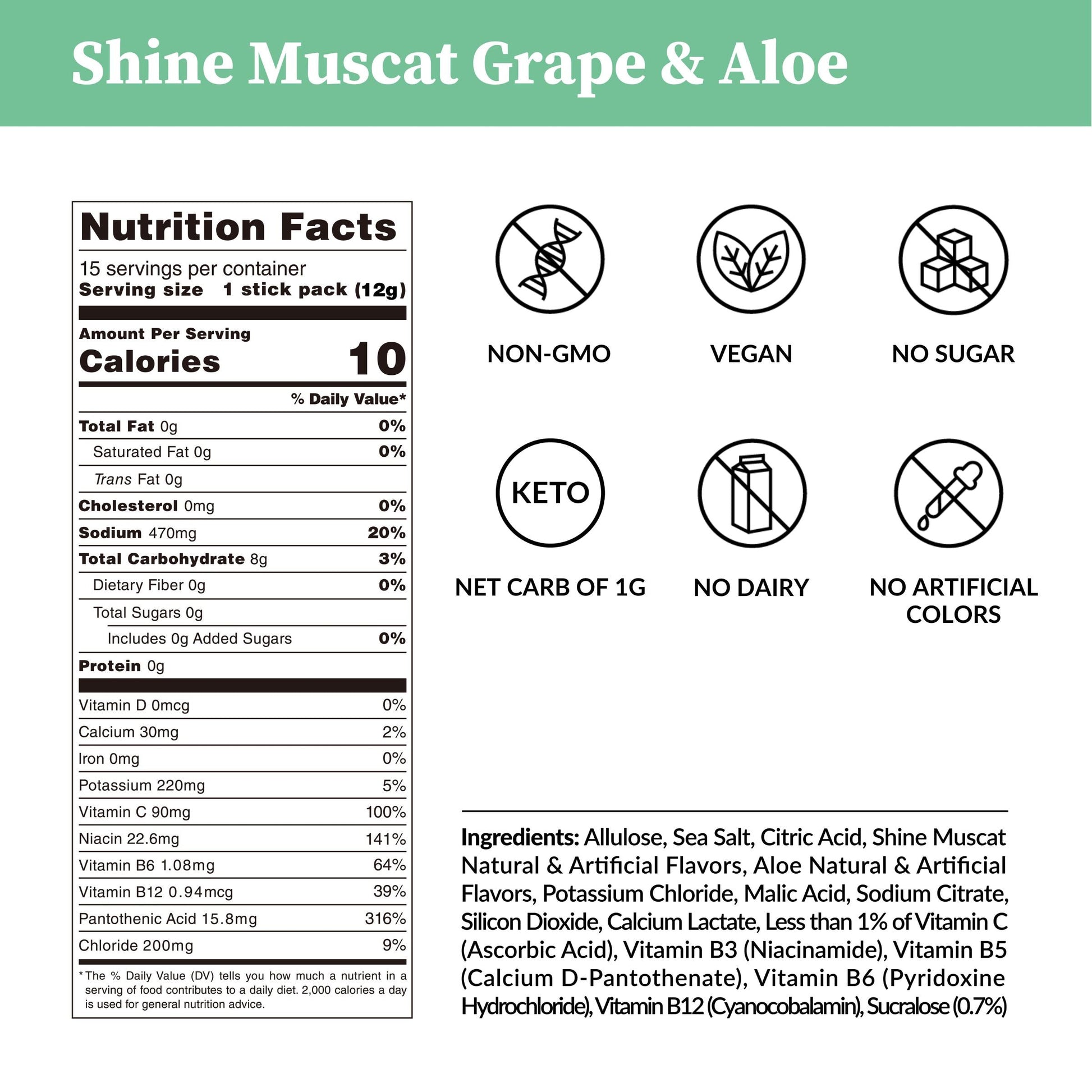 Enjoy the crisp sweetness of shine muscat grapes with the cooling refreshment of aloe — a combo that’s easy to love. Each pouch includes 15 sticks, each packed with over 1,000mg of electrolytes and essential vitamins — all without the sugar.