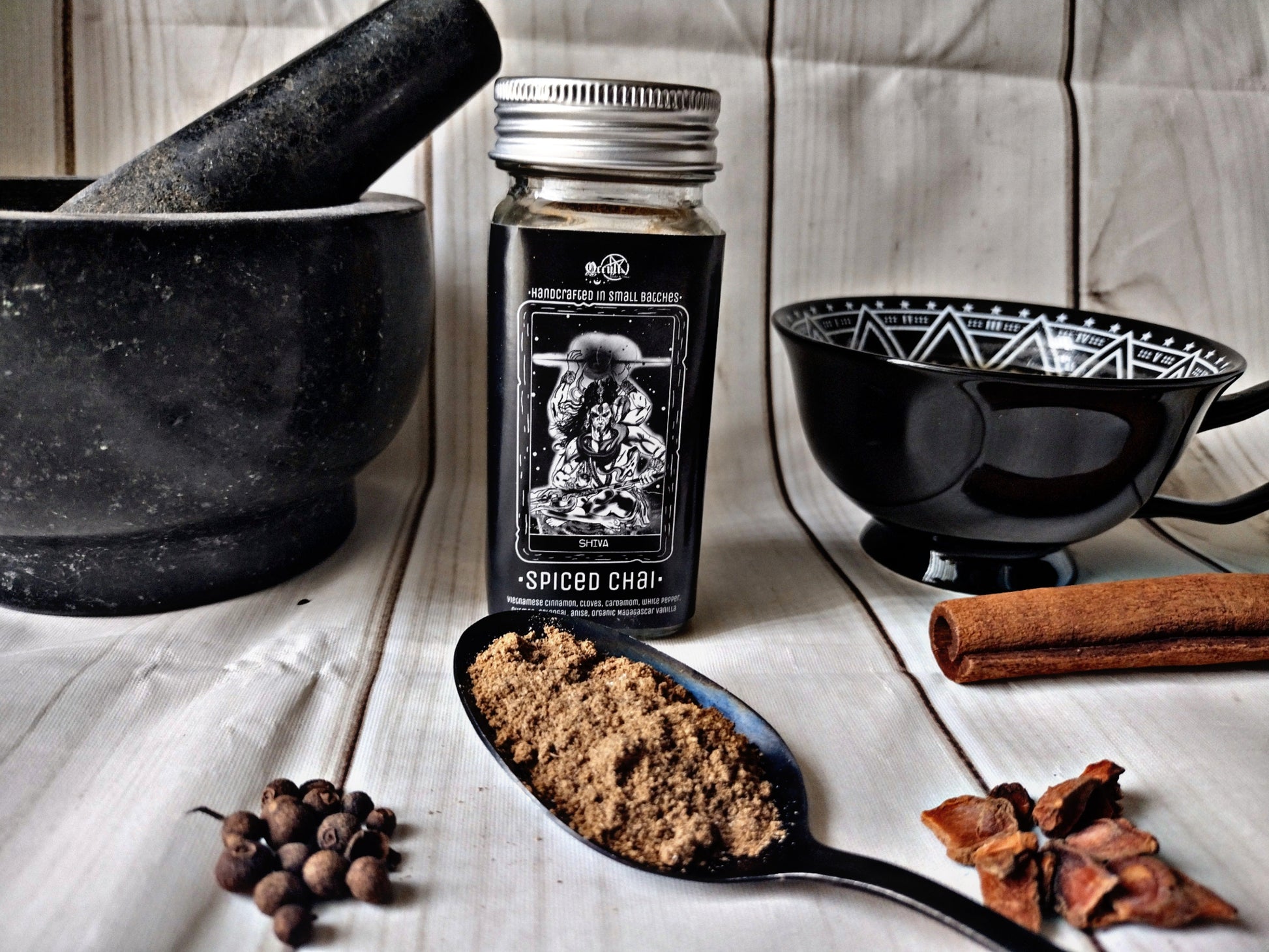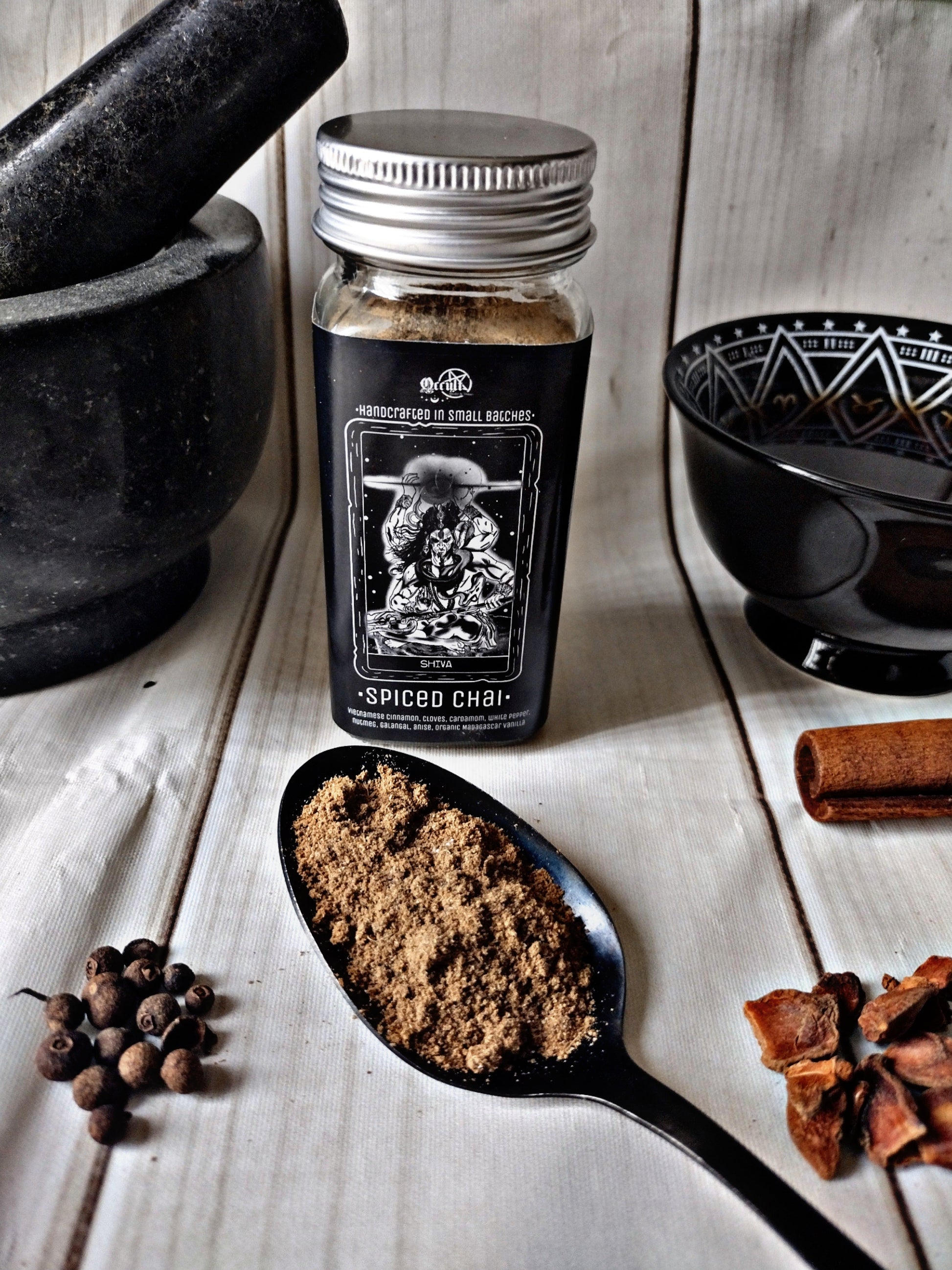 Named in honor of a powerful deity, Shiva is our aromatic ode to balance, warmth, and strength. This captivating chai-inspired blend layers Vietnamese cinnamon, cardamom, ginger, galangal, nutmeg, white pepper, cloves, anise, and a touch of organic Madagascar vanilla powder for depth and sweetness.