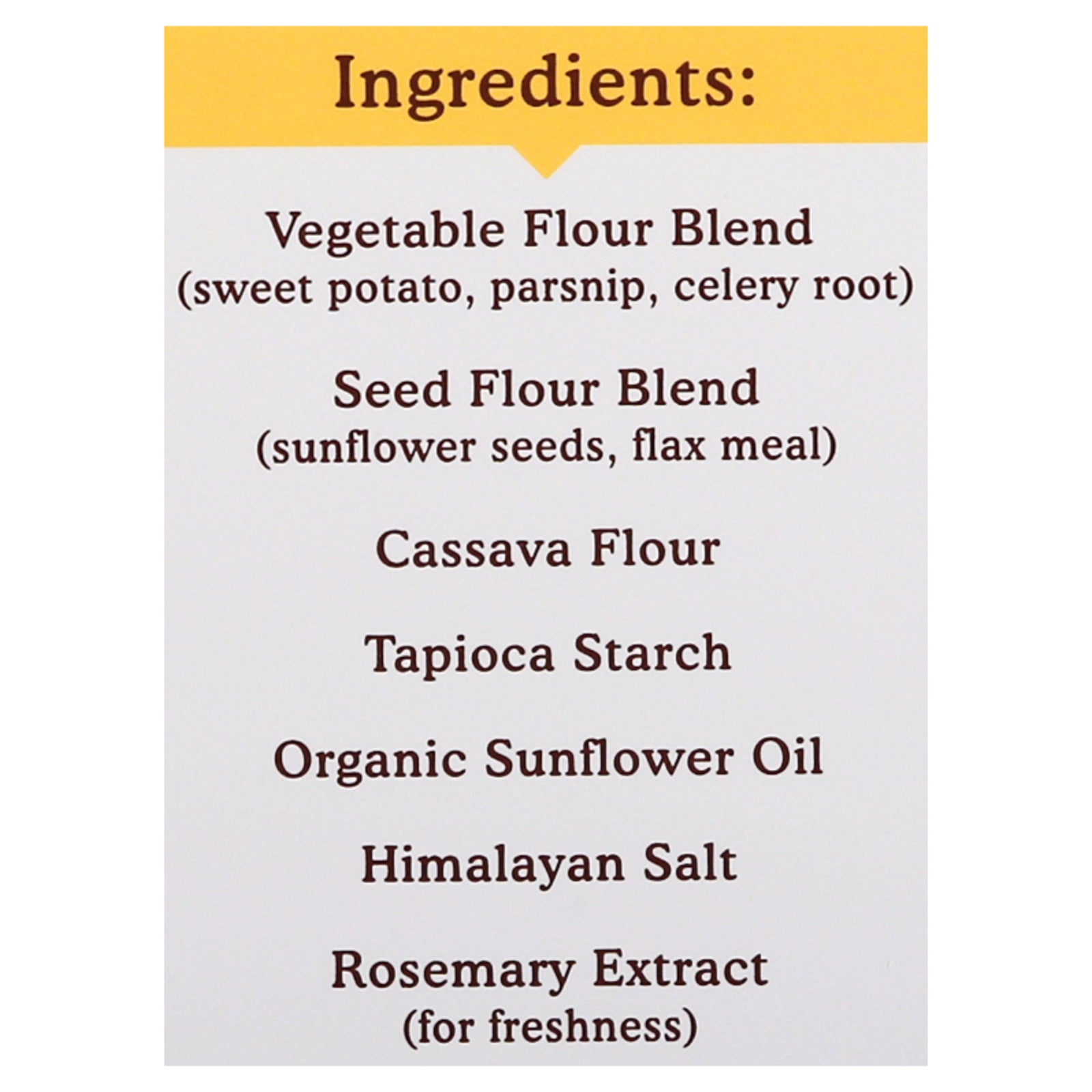 Each cracker is crafted from a wholesome blend of vegetable and seed flours, including sweet potato and parsnip, offering a unique and satisfying crunch. Packaged in a convenient case of six 4.25 oz boxes, these snacks are perfect for sharing or enjoying on your own. Savor the freshness, enhanced by a touch of rosemary extract, and enjoy a guilt-free snacking option that pairs perfectly with your favorite dips and spreads.