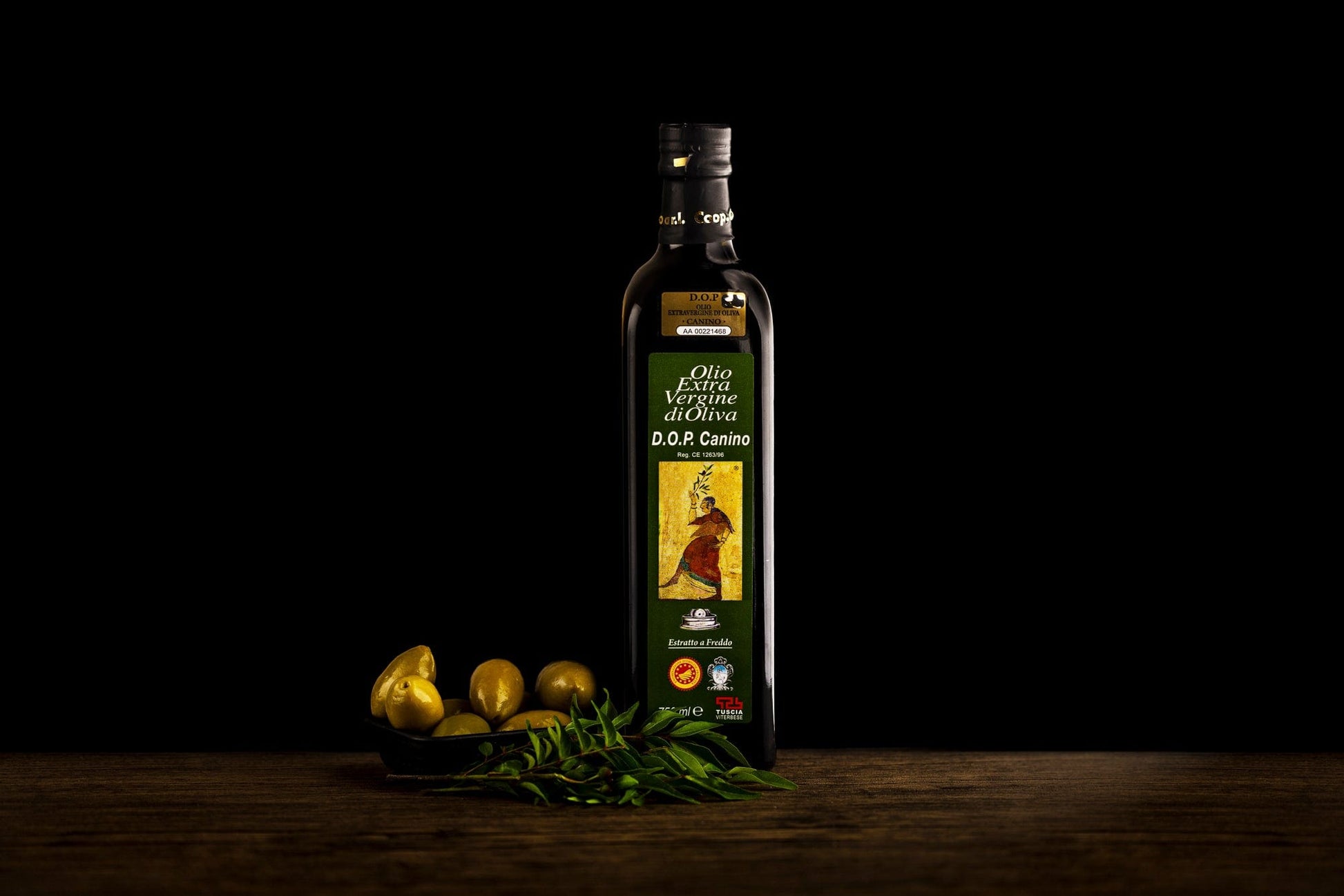 The extra virgin olive oil "D.O.P. Canino" is obtained from a single variety of Caninese olives, from a grove of trees that dates back to the Etruscan era. For the olives to be included, they need to come from trees that are over 100 years old!