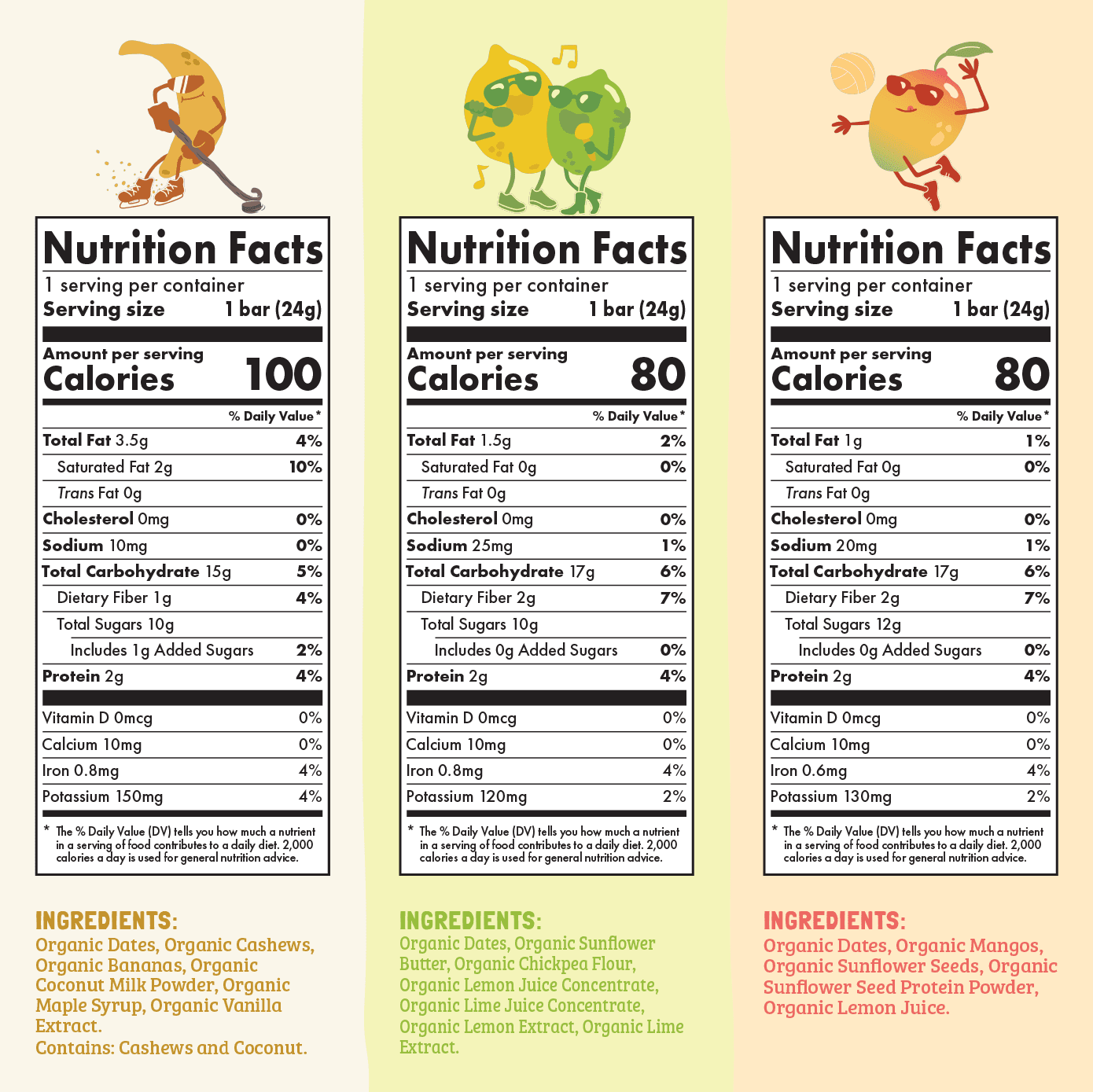 Organic Dates, Organic Sunflower Butter, Organic Chickpea Flour, Organic Lemon Juice Concentrate, Organic Lime Juice Concentrate, Organic Lemon Extract, Organic Lime Extract.