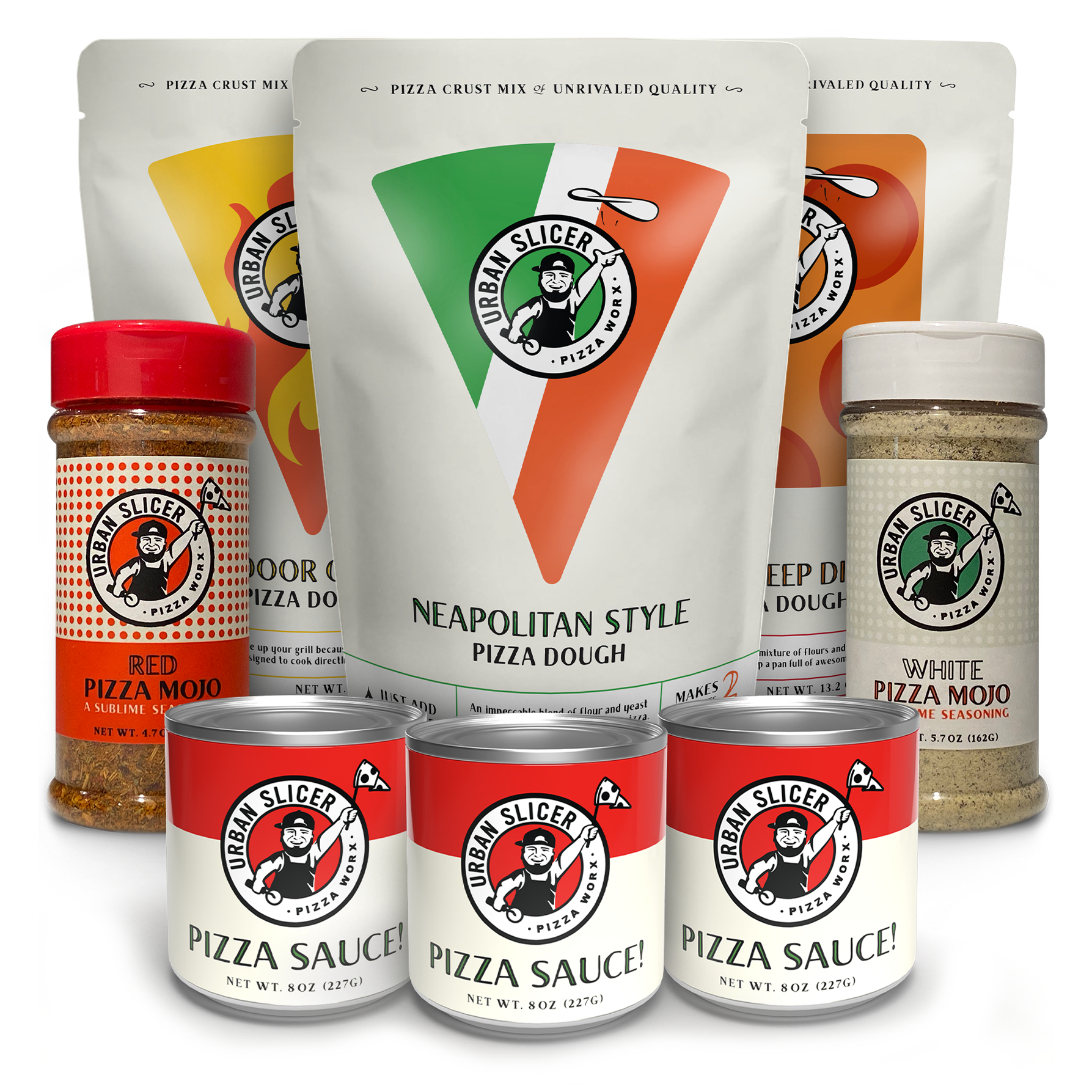 One pack of each Urban Slicer crust mix, plus 3 cans of Pizza Sauce, plus a bottle of each Pizza Mojo! Includes Outdoor Grilling Dough, Neapolitan Style and Epic Deep Dish. That's enough goods to make 6 pizzas and season up everything you cook!