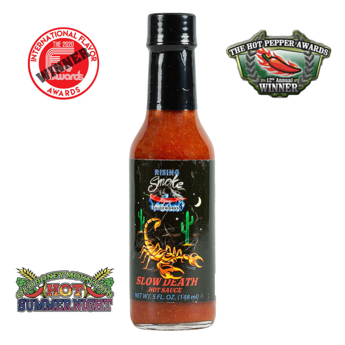 Slow Death is a fiery symphony for true chili enthusiasts. Packed with the bold essence of Trinidad Scorpion peppers and a generous dose of garlic, this sauce delivers an intense, tongue-tingling heat from the get-go. As you savor the initial bright notes, a slow, creeping mouth burn unfolds, leaving a lingering warmth that's sure to satisfy the heat-seeking palate. With a carefully crafted blend of ingredients, Slow Death is a flavor-packed adventure for those who crave the perfect balance of spice and smokiness.