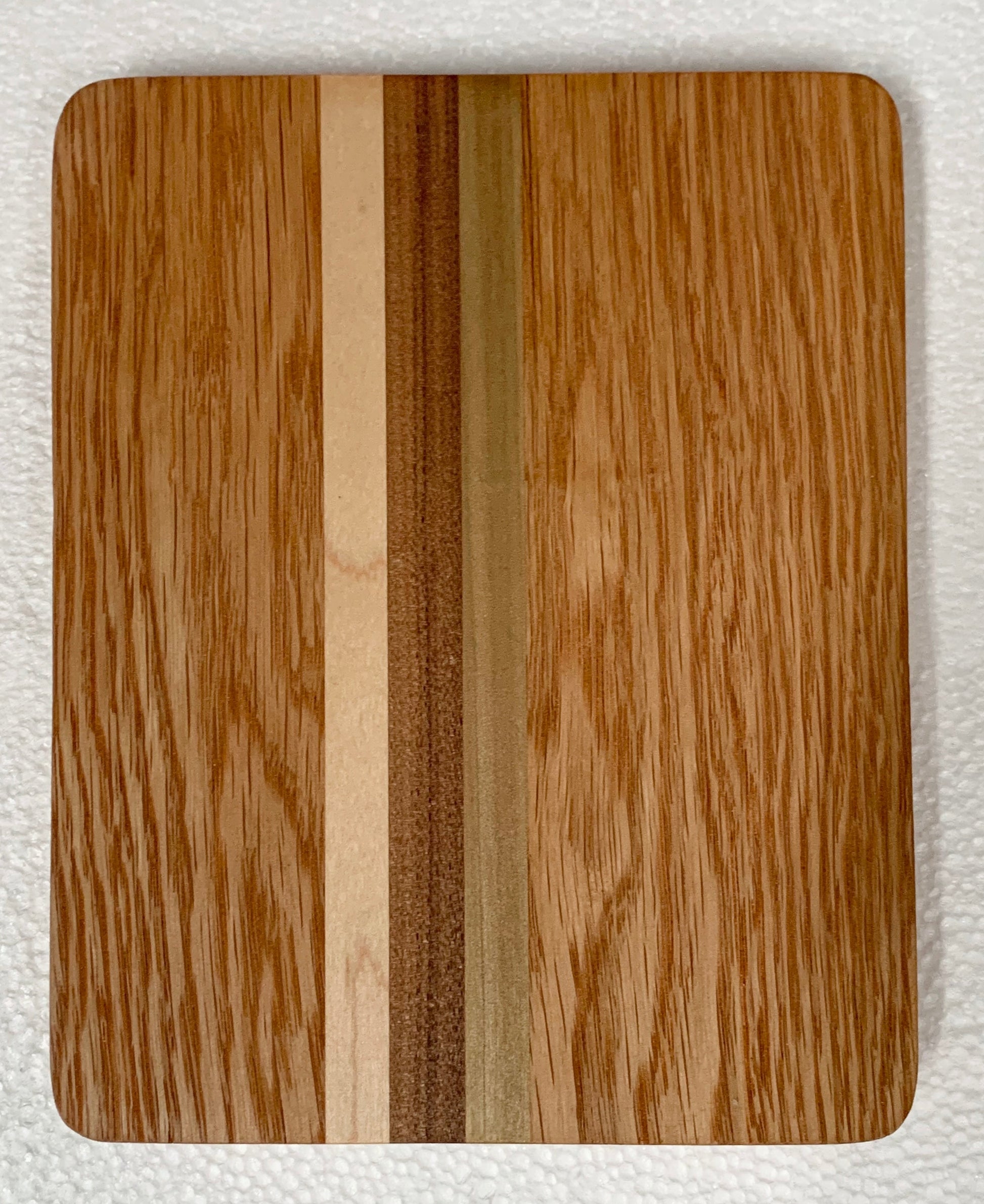 Small, durable, multicolored wooden cutting board perfect for entertaining with fresh sliced cheese and accompaniments.