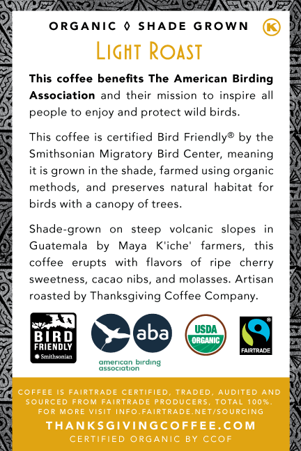 Each package sold benefits the American Birding Association's programs. By drinking shade-grown and bird friendly certified coffee every morning, you are supporting these coffee farmers, the efforts of the ABA, and the countless birds they are protecting through community outreach and conservation. Learn more.