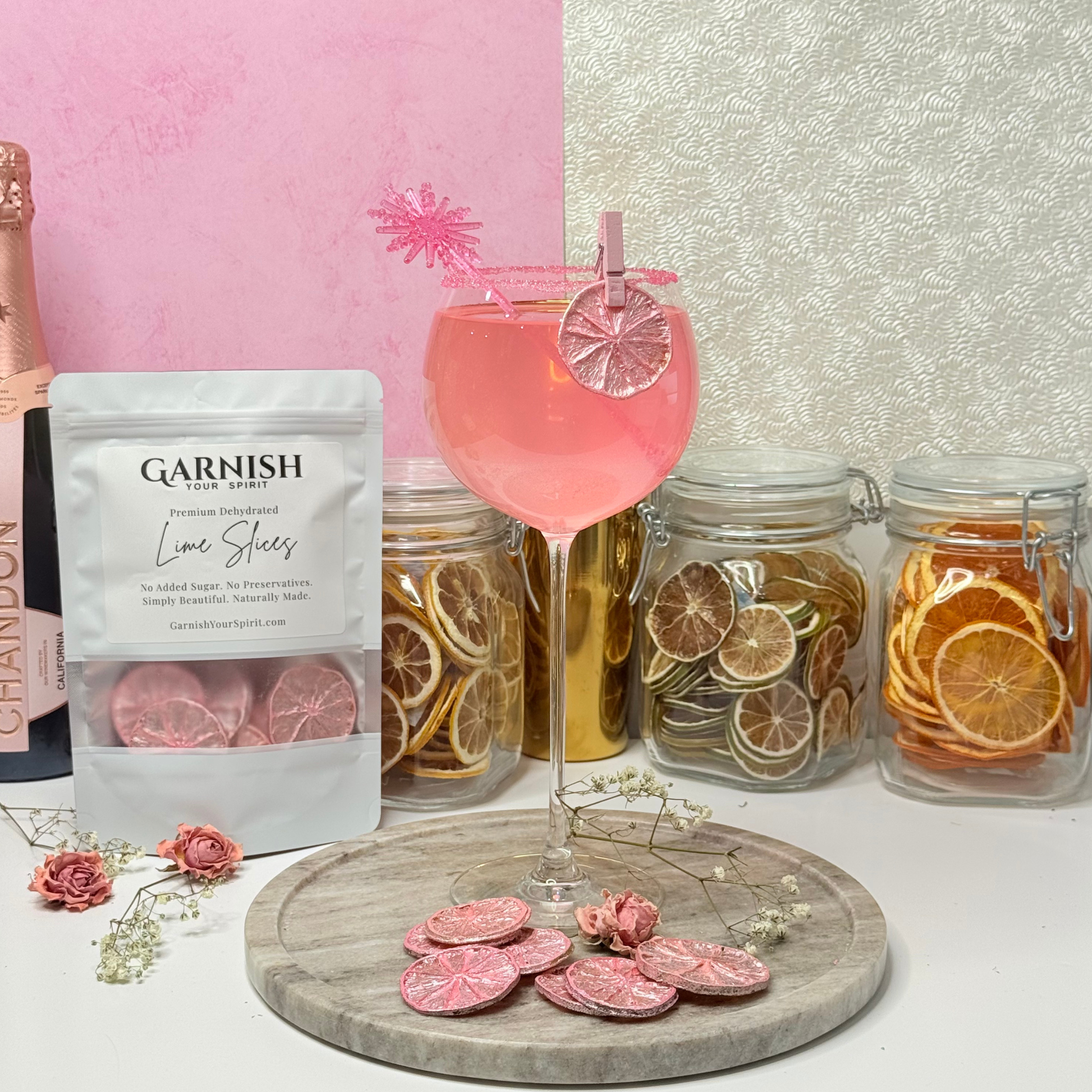 Bring a soft pop of sparkle to your decor and creations with our Special Limited time Pink Luster Dust Dried Lime Slices.