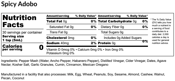 Ingredients: Pepper Mash (Water, Ancho Pepper, Habanero Pepper), Distilled Vinegar, Cider Vinegar, Dates, Agave Nectar, Kosher Salt, Garlic Granules, Cumin, Cinnamon, Mexican Oregano