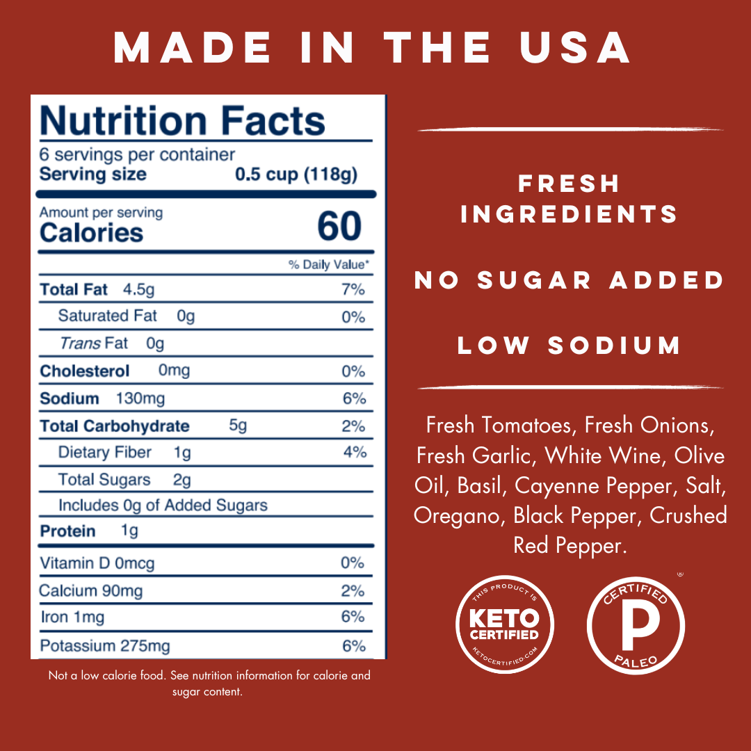 All of Yo Mama’s Tomato Sauce creations are cooked in small-batches using garden-fresh ripe tomatoes, with the cleanest ingredients we can find. Our Mama-approved recipe is free from added sugar, GMOs, preservatives, and gluten, ensuring a pure and wholesome taste experience.