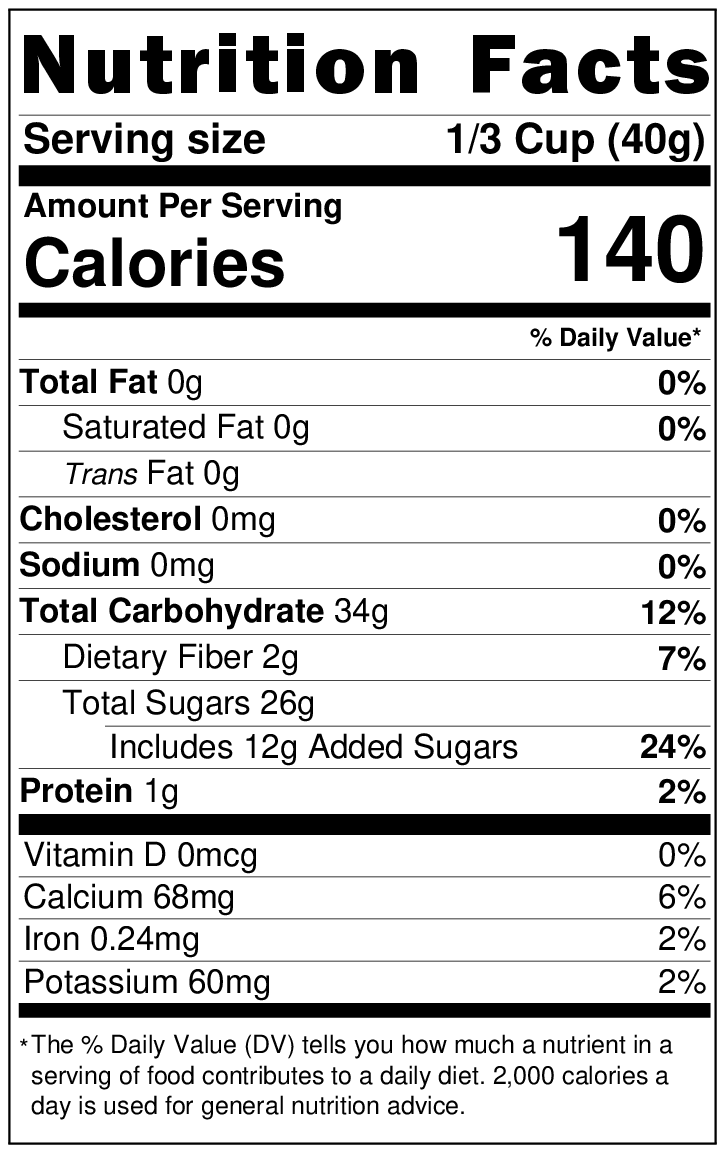 Allergen Statement: Product packed in a facility that also handles nuts, peanuts, soy, sesame, and wheat. 8 oz and 2 lb sizes only.
